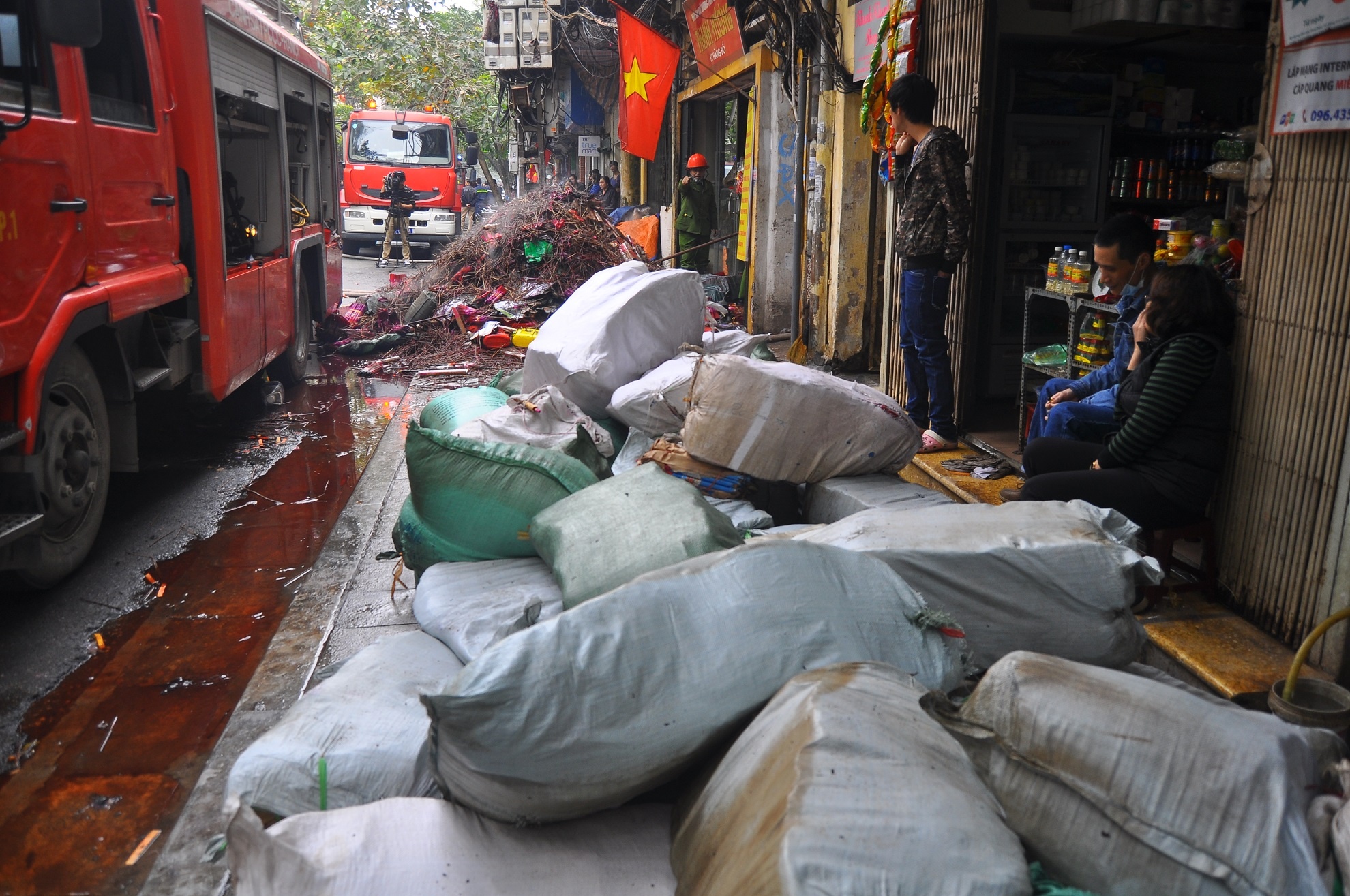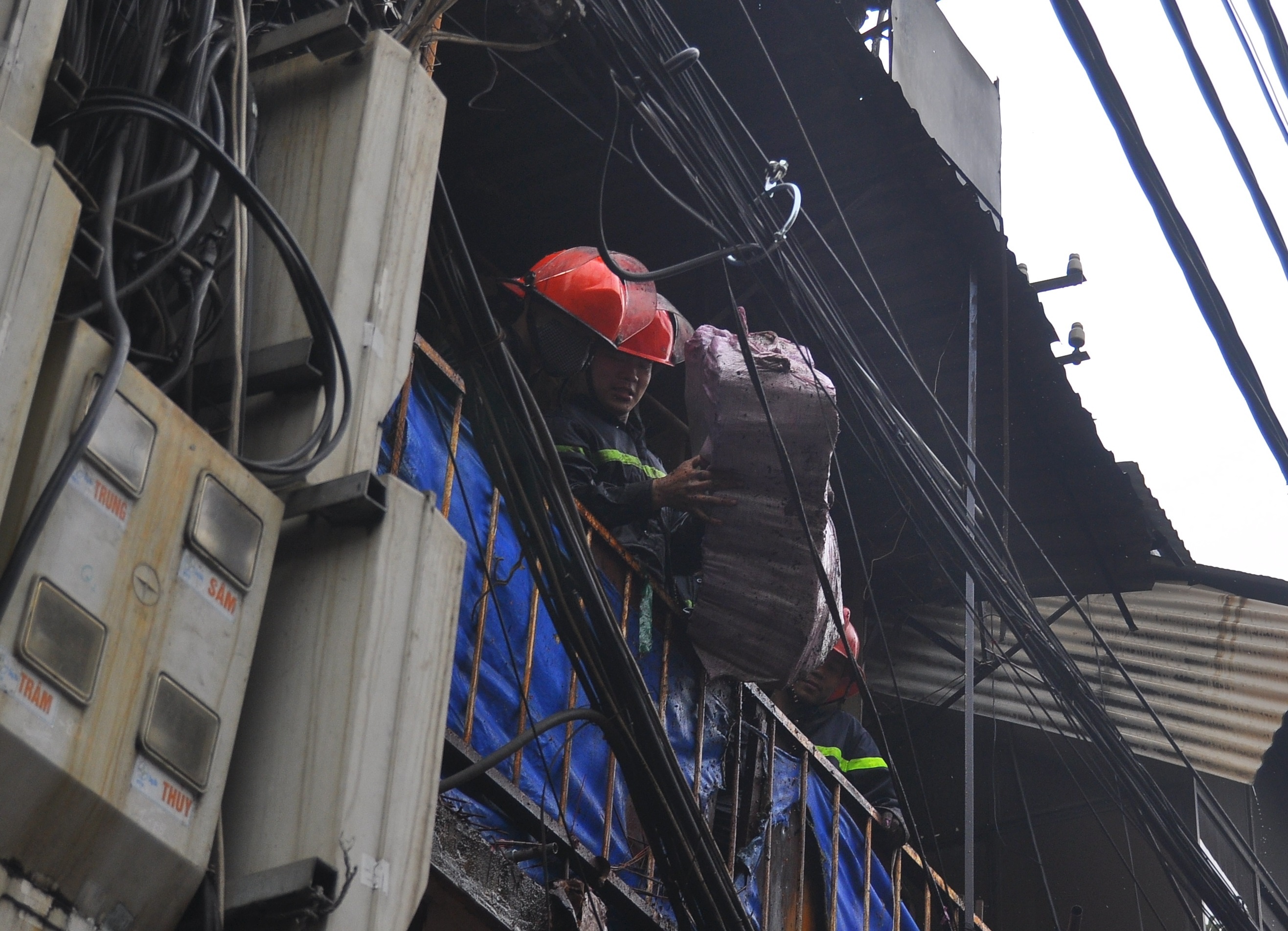 Đại tá Vụ cũng cho biết sau khi tới hiện trường, các chiến sĩ đã triển khai cứu 3 người dân có mặt trên tầng 2, tầng 3 rời khỏi nơi nguy hiểm, đồng thời vừa chữa cháy theo hai hướng từ trên cao và trực diện trước ngôi nhà. Sau 45 phút, ngọn lửa cơ bản được khống chế, tuy nhiên khu vực tầng 3 bị đổ tường chắn lối tiếp cận vì vậy phải tới 11h mới có thể dập tặt hoàn toàn vụ hỏa hoạn. Trong quá trình cứu hỏa, chiến sĩ Vũ Mạnh Dũng (30 tuổi) đã bị ngạt khói và được đưa ra ngoài nhờ nhân viên y tế hỗ trợ và đã hồi phục sức khỏe ngay sau đó. Trong ảnh, số hàng hóa, vật dụng của các hộ dân trong ngôi nhà bị cháy được cứu ra ngoài.