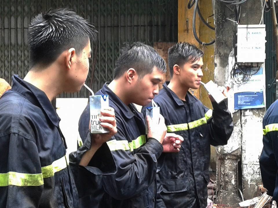 Sau khi đổi ca các chiến sĩ PCCC được phân phát nước và sữa lấy lại sức khoẻ để tiếp tục cứu hộ.