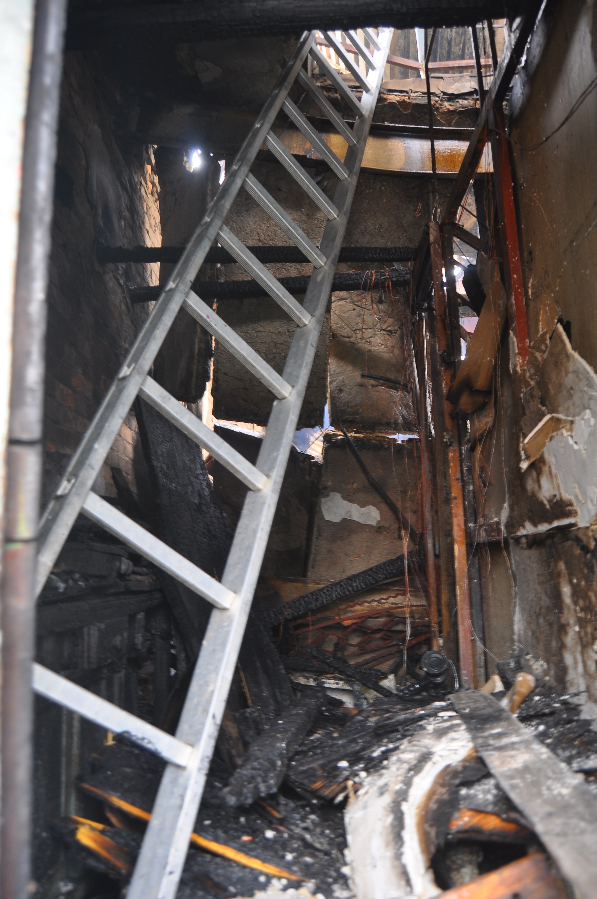 | Công tác khắc phục sau vụ cháy đang được nhanh chóng triển khai. Các chiến sĩ PCCC dùng cào để kéo hương tàn được đưa từ căn phòng tầng 2 xuống dưới đất. |