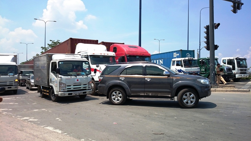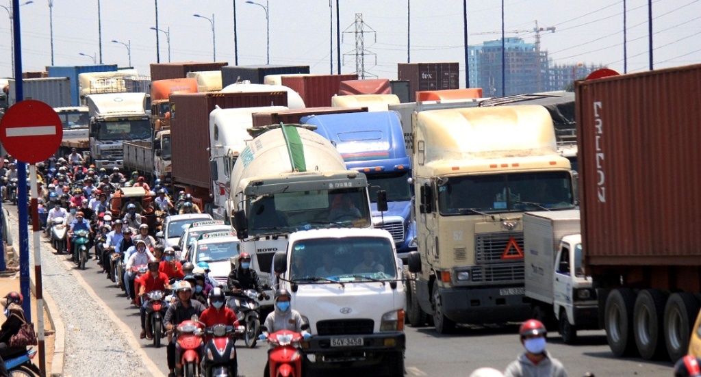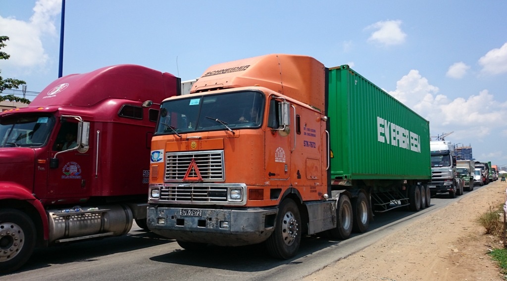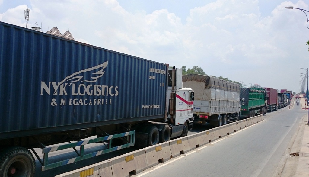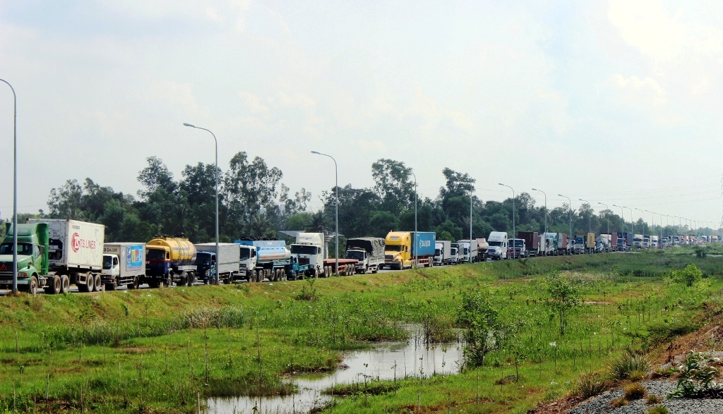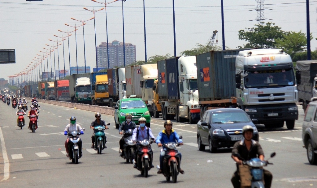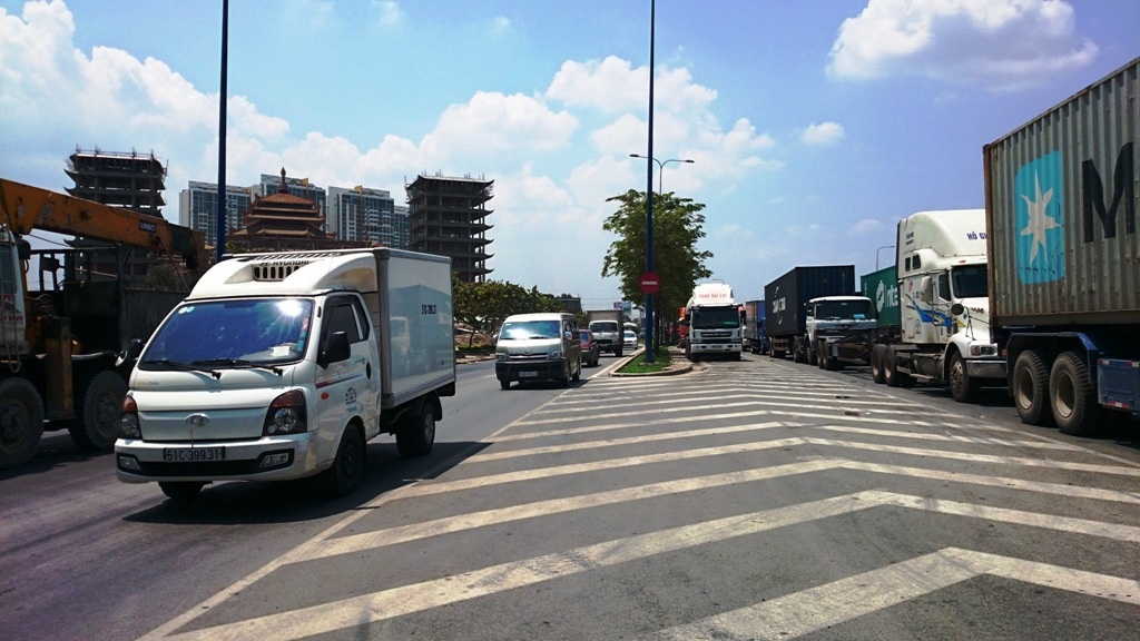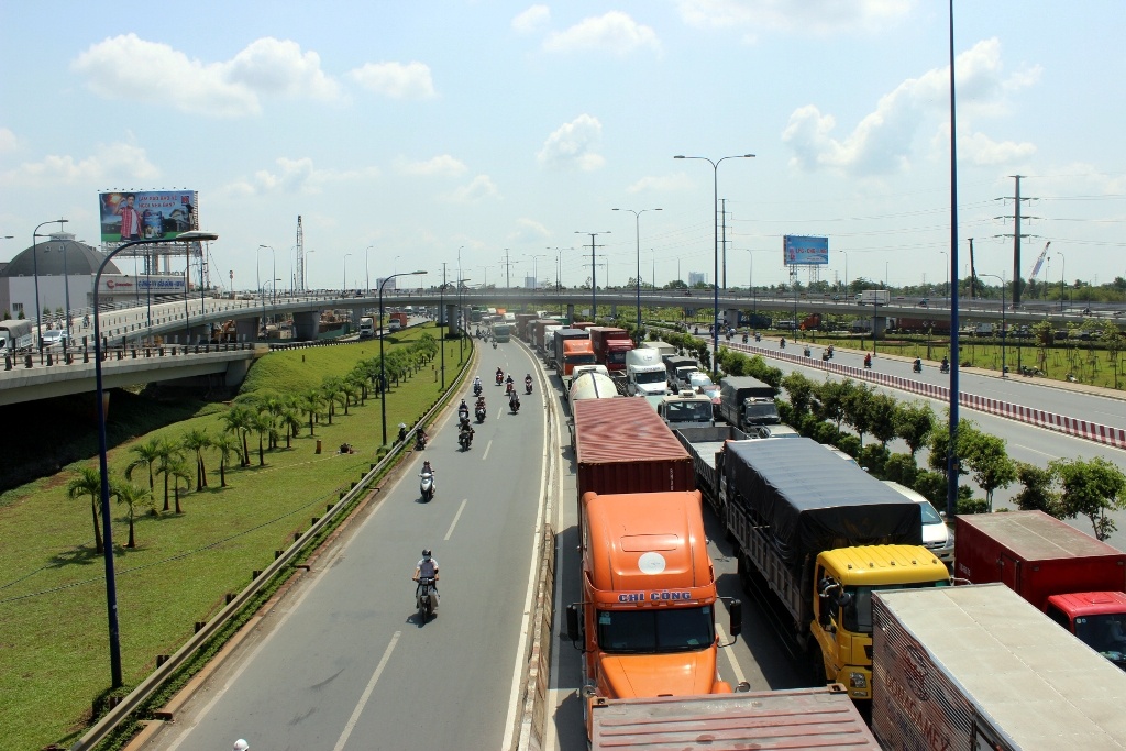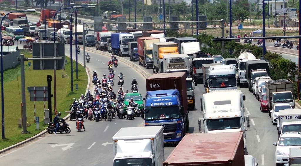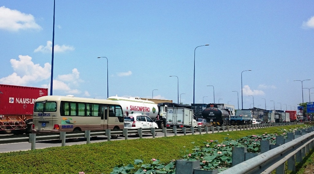 | Khoảng 2h ngày 9/5, xa lộ Hà Nội, hướng từ Đồng Nai vào Sài Gòn bắt đầu kẹt xe kéo dài do các xe tải, xe đầu kéo đổ về ngã ba Cát Lái để vào cao tốc TP HCM - Long Thành - Dầu Giây. |