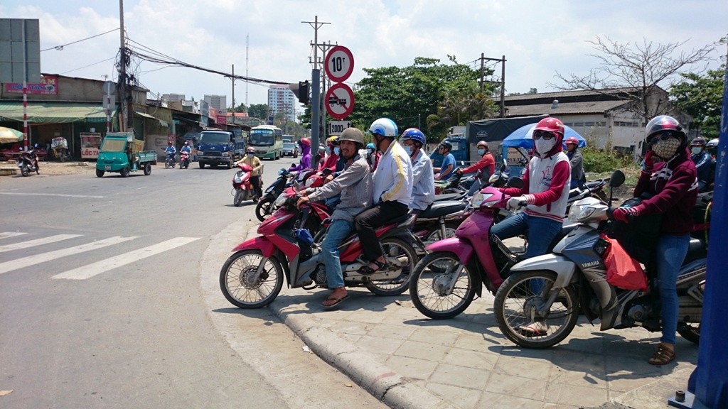 | Không còn đường chạy, người đi xe máy bị dồn hết lên vỉa hè, đứng chờ được lưu thông dưới nắng nóng. |