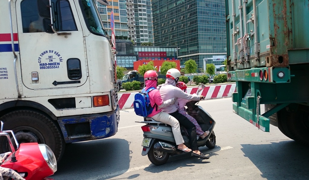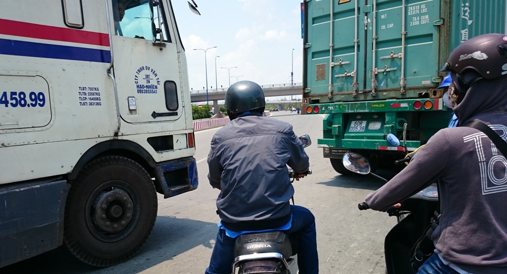 | Bị các xe lớn chặn ngang đường, nhiều người tham gia giao thông phải mạo hiểm lách qua các khe hở giữa các xe đầu kéo, tiếp tục hành trình dù tiếng bấm còi vang lên inh ỏi cả khu vực. |