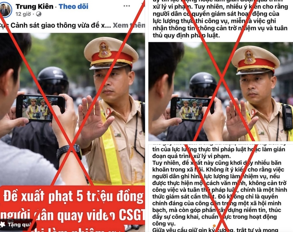 Theo đó, thời gian gần đây xuất hiện bài viết cho rằng Cục CSGT “đề xuất xử phạt 5 triệu đồng đối với cá nhân quay video lực lượng Cảnh sát giao thông khi đang làm nhiệm vụ mà chưa được sự cho phép”. Bài viết kèm theo hình ảnh minh họa được cho là do trí tuệ nhân tạo (AI) tạo lập.