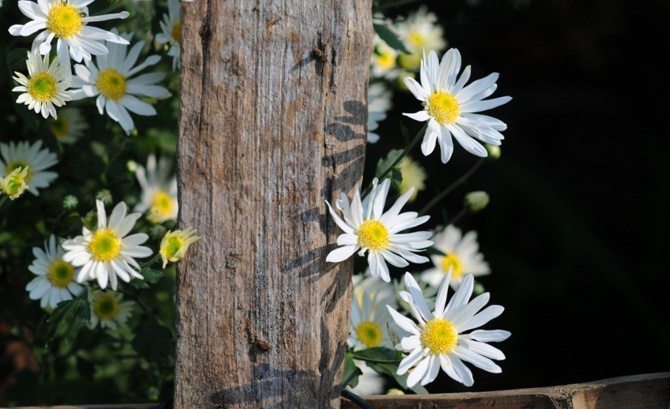 Cúc họa mi được trồng xen với những luống đào và cúc đại đóa..