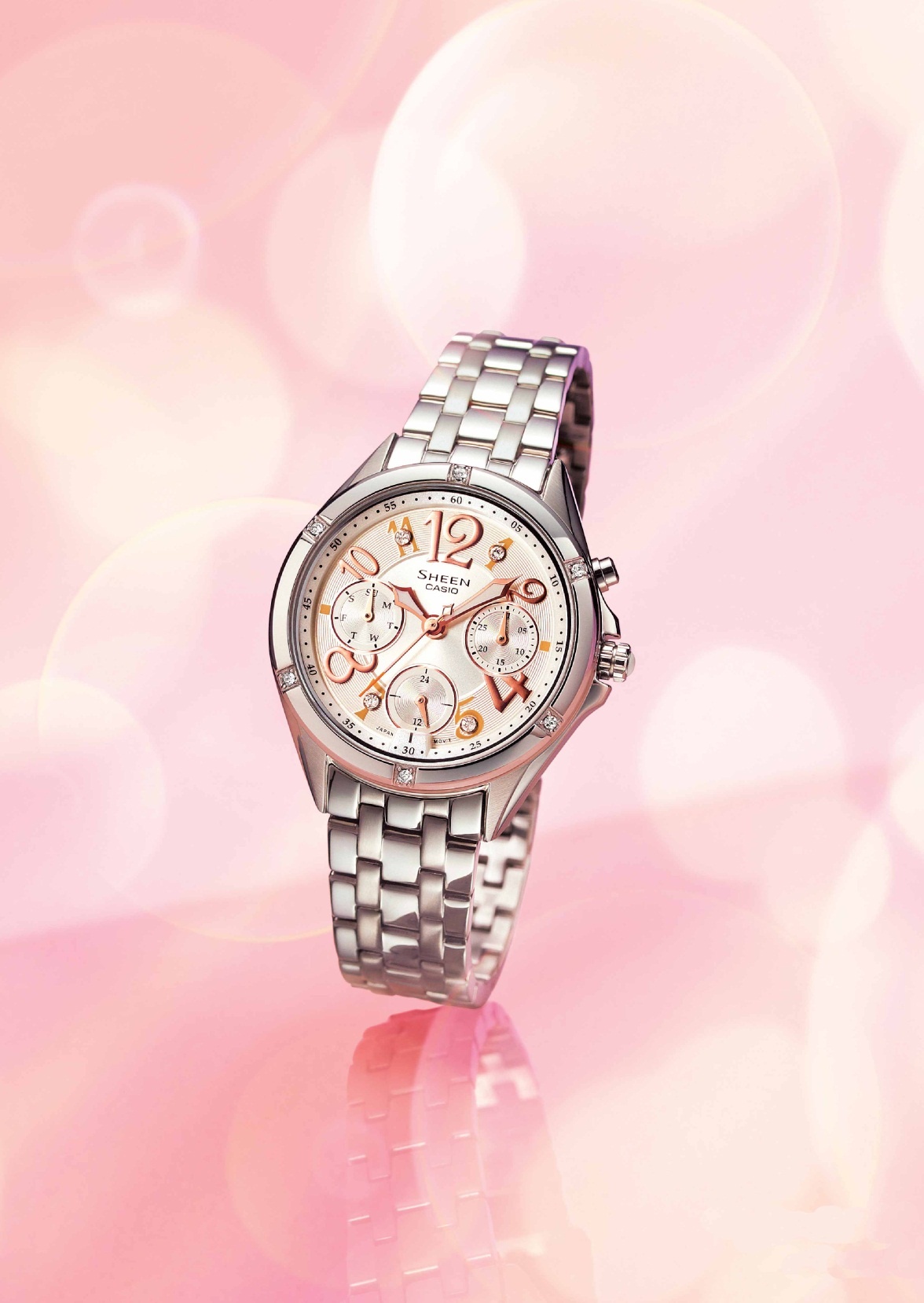Sở hữu gam màu RoseGold sành điệu kết hợp cùng các thiết kế đính đá lấp lánh đậm chất vintage, đồng hồ Casio Sheen thường được phái đẹp sử dụng khi đi dự tiệc. Sản phẩm rất dễ kết hợp với váy đầm và trang sức lấp lánh khác.