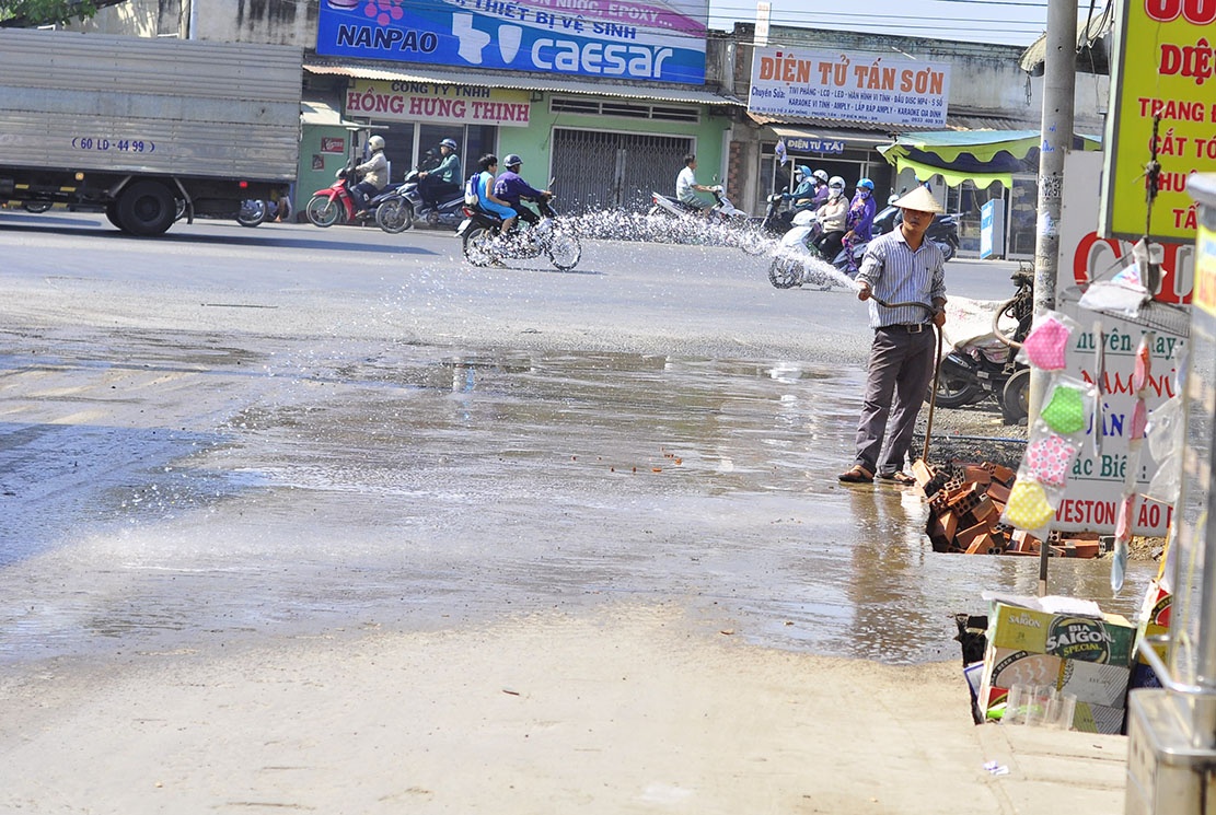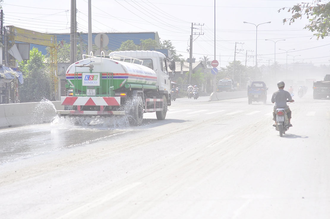 | Một người dân sống gần giao lộ Đinh Quang Ân - quốc lộ 51 cho biết, cứ 15 phút, anh phải tưới nước lên mặt đường để hạn chế bụi. |