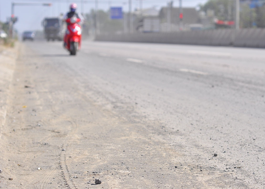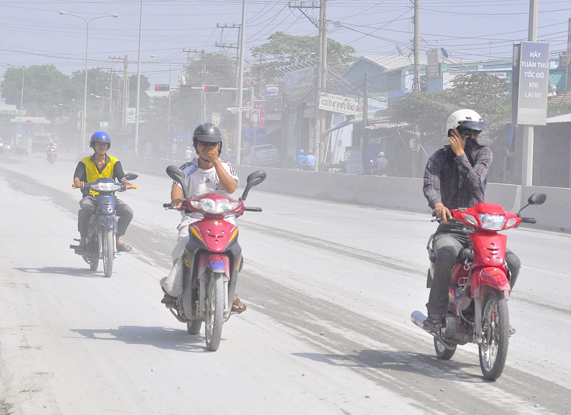 | Bề mặt quốc lộ qua khu vực thị xã Dĩ An luôn có lớp "thảm" đất, cát và đá dăm... |