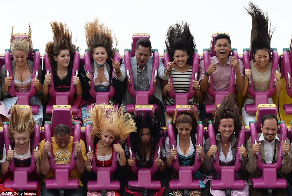 | Những người tham dự lễ hội không ngần ngại leo lên chiếc ghế quay cảm giác mạnh, bất chấp dạ dày đầy bia. Ảnh: AFP |