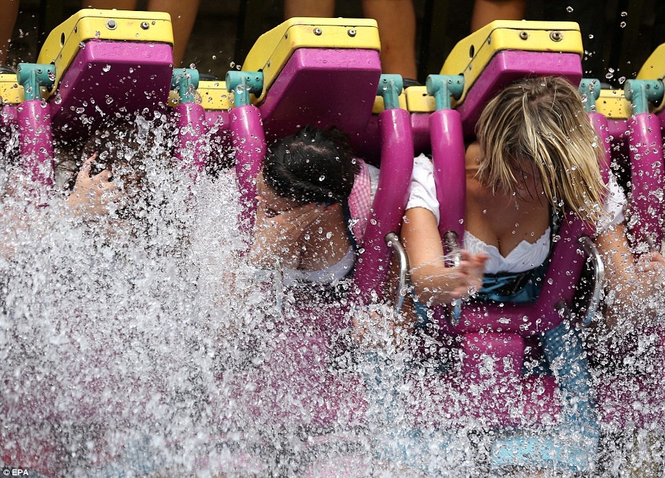 | Không chỉ tham gia trò chơi đu quay, họ còn được tắm trong biển bia theo đúng nghĩa đen. Ảnh: EPA |