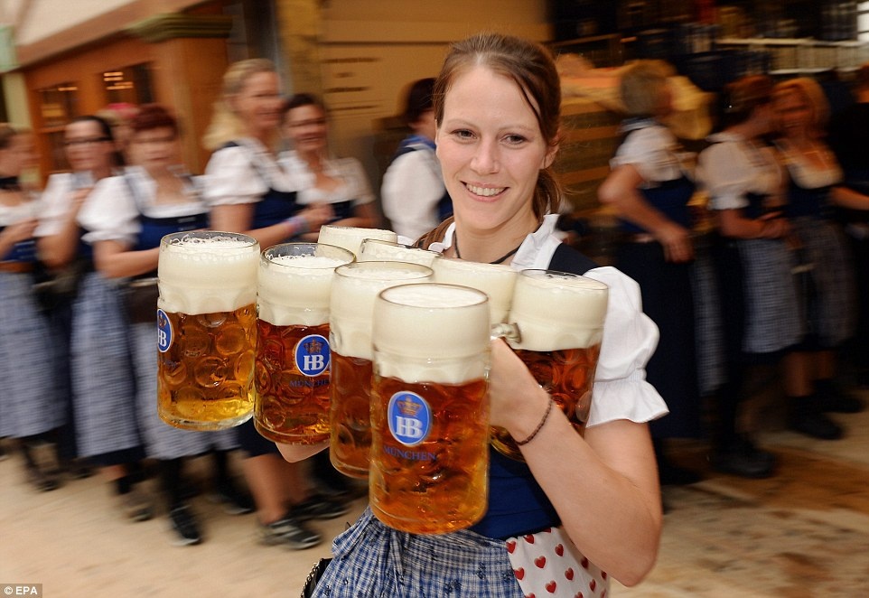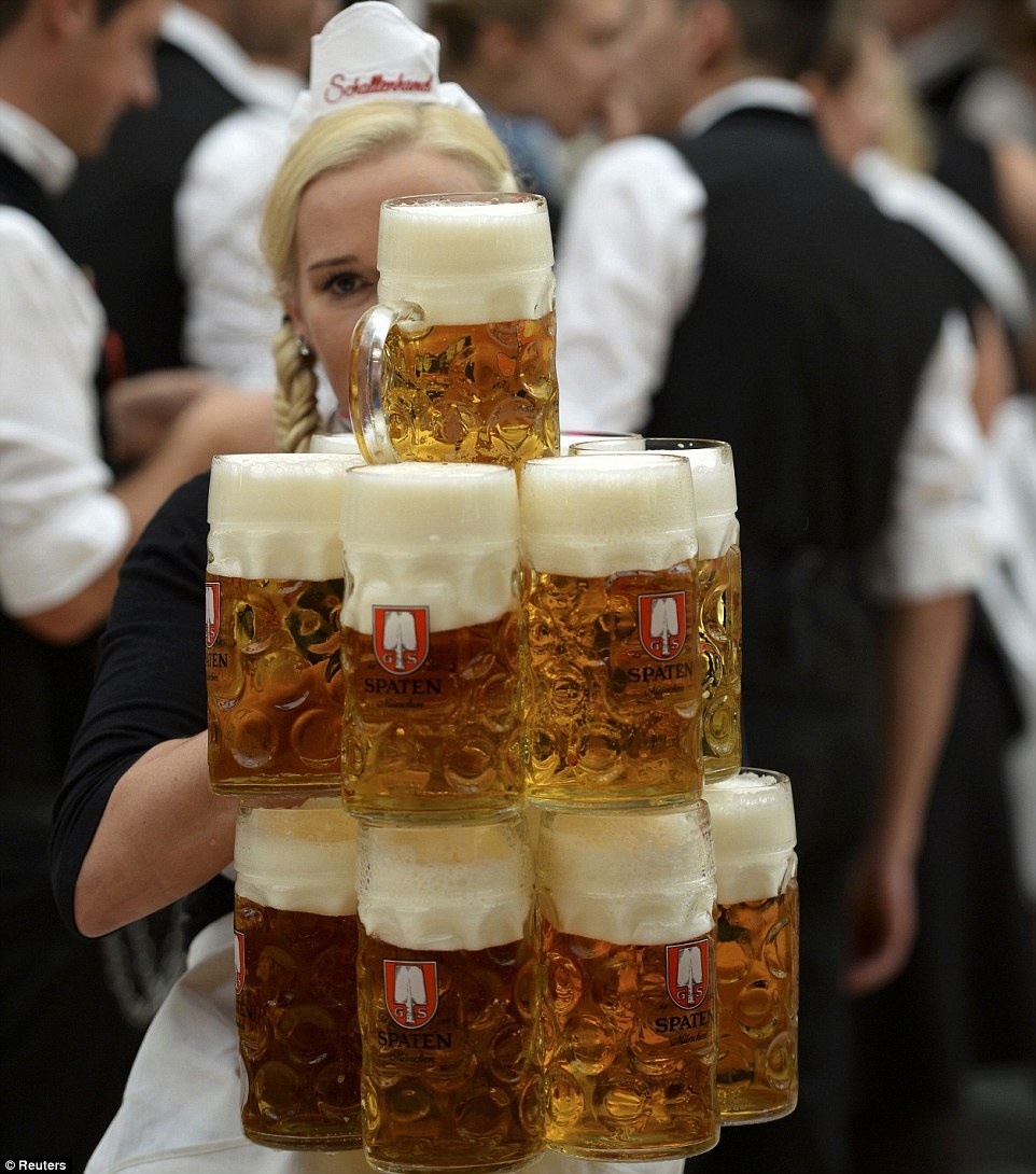 | Việc mang hơn 10 cốc bia một lúc dường như không làm khó các cô bồi bàn trong trang phục truyền thống. Ảnh Reuters |