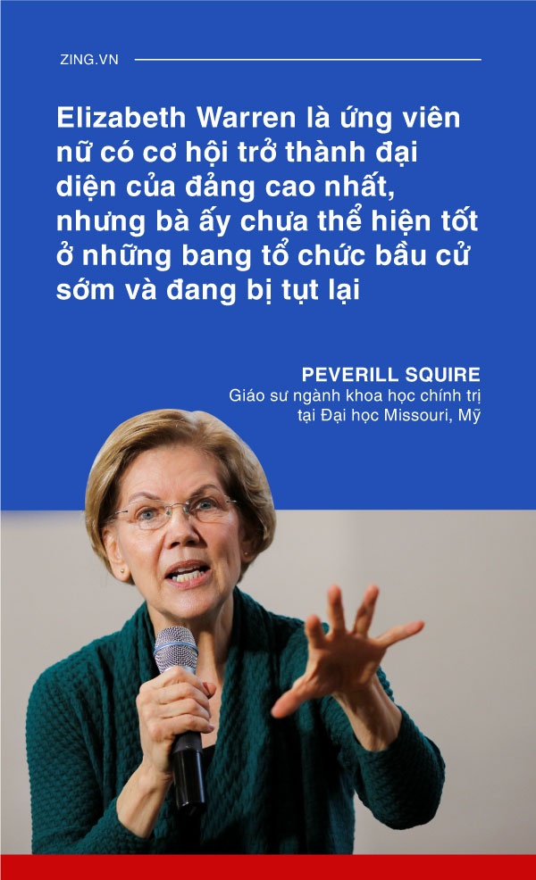 So với hai ứng viên này, bà Warren tham gia chính trị chưa lâu, nhưng bà ấy hiện là ứng viên nữ có cơ hội trở thành đại diện của đảng cao nhất. Tuy nhiên, bà Warren cũng đang có nguy cơ vì bà ấy chưa thể hiện tốt ở những bang tổ chức bầu cử sớm và đang bị tụt lại. Dạo gần đây, Warren đang nỗ lực tại các bang này. Nhưng vẫn nên chờ đến khi có kết quả phiếu thực sự thì chúng ta sẽ có cái nhìn rõ hơn về các ứng viên dẫn đầu.
