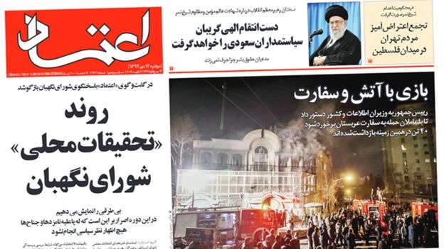 | Nhật báo Etemad đăng bài về vụ biểu tình tại đại sứ quán Saudi Arabia tại Iran. Ảnh: