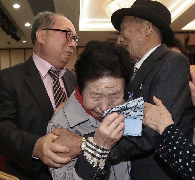 Bà Lee Jin Goo không kìm được nước mắt bởi sau rất nhiều năm mới gặp anh trai Lee Yong Goo đang sống ở miền bắc. |