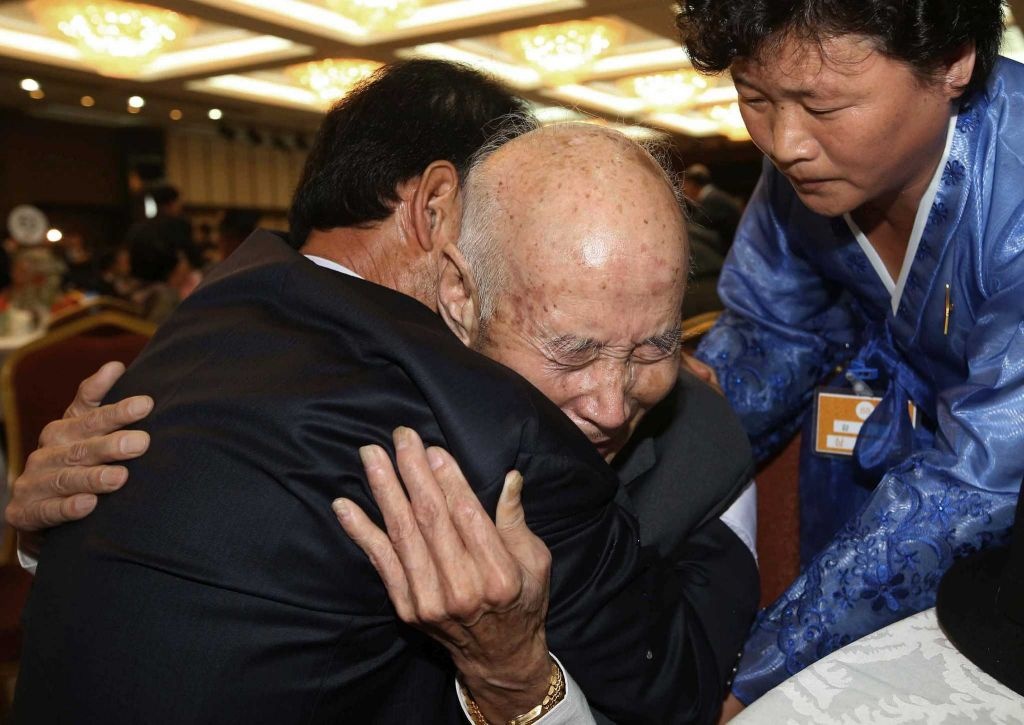 Cụ ông Chae Hun Sik, 88 tuổi, ôm người thân Chae Hee-yang đang sống ở Hàn Quốc. Hầu hết những người dự buổi đoàn tụ Hàn - Triều đều trên 80 tuổi và đây có lẽ là cơ hội cuối cùng của họ để gặp người thân. |