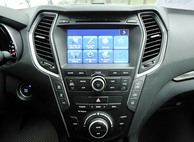 | Bảng điều khiển trung tâm trên Santa Fe nổi bật với màn hình DVD tích hợp bản đồ phát triển riêng cho thị trường Việt Nam. |