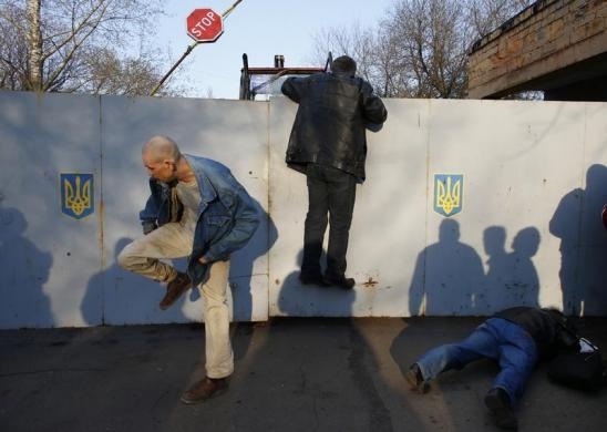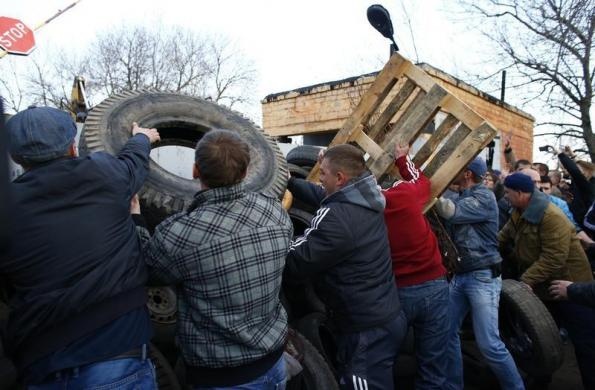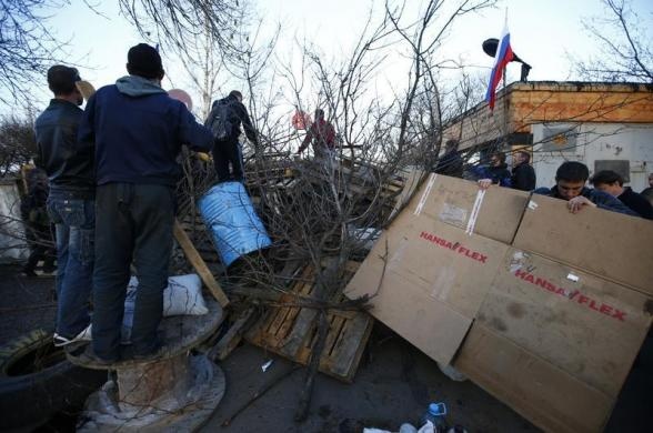 Người biểu tình lập thành lũy bên ngoài tòa nhà công quyền ở Slaviansk nhằm chống lại động thái triển khai quân của chính quyền lâm thời Ukraina. |