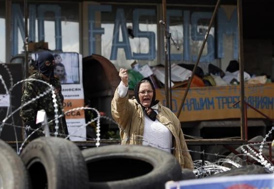 Người phụ nữ lớn tuổi hô vang khẩu ngữ phía trước rào chắn một tòa nhà chính phủ ở Donetsk. Đây là khu vực tuyên bố ly khai khỏi Ukraina trong ngày 7/4. |