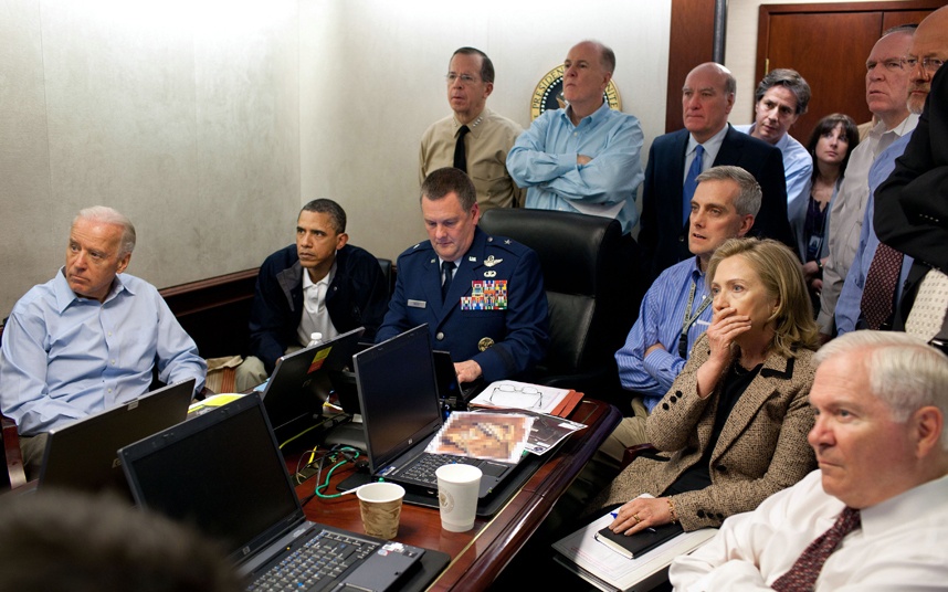 | Trong chiến dịch tiêu diệt trùm khủng bố Osama bin Laden, Obama cùng nhiều quan chức cấp cao Mỹ theo dõi diễn biến cuộc đột kích qua màn hình ở Phòng Tình huống tại Nhà Trắng tháng 5/2011. Ảnh: White House |