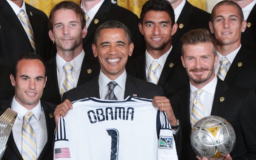 Buổi gặp gỡ của Obama và các cầu thủ câu lạc bộ bóng đá LA Galaxy diễn ra rất thân mật, vui vẻ bởi tổng thống là người yêu thể thao, đặc biệt là bóng rổ và bóng đá. Ông dành nhiều thời gian trò chuyện với các cầu thủ chủ chốt của đội. Ảnh: AFP