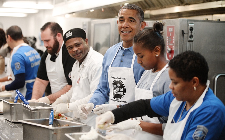 Người đàn ông quyền lực nhất nước Mỹ cùng con gái Sasha vào bếp chuẩn bị bữa ăn cho người nghèo, người vô gia cư ở thủ đô Washington nhân Ngày Martin Luther King. Năm 2008, ông tuyên bố tranh cử tổng thống và đánh bại đối thủ chính là ứng cử viên Cộng hòa John McCain, trở thành tổng thống thứ 44 của Mỹ. Ông là người Mỹ gốc Phi đầu tiên đắc cử chức vụ này. Ảnh: Getty