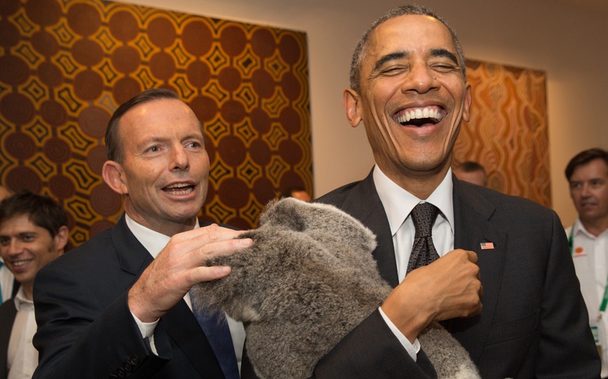 Thủ tướng Australia Tony Abbott và Barack Obama gặp nhau tại sự kiện bên lề Hội nghị Nhóm các nền kinh tế phát triển và mới nổi (G20) ở Brisbane, Australia. Ảnh: Andrew Taylor