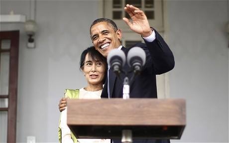 | Ngày 19/11/2012, nhân chuyến thăm Myanmar, Tổng thống Mỹ Barack Obama gặp thủ lĩnh phe đối lập tại dinh thự của bà. Ông không ngần ngại ôm và hôn bà Suu Kyi tại cuối buổi họp báo chung. Trước đó, ngày 20/9/2012, Quốc hội Mỹ trao tặng huân chương vàng – phần thưởng dân sự cao quý nhất của Mỹ - để ghi nhận những cống hiến của bà cho cuộc đấu tranh vì dân chủ tại Myanmar. |