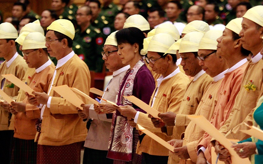 Hai năm sau khi được phóng thích, bà Suu Kyi chính thức trở thành thành viên Hạ viện Myanmar trong cuộc bầu cử ngày 1/4/2012. Suu Kyi (giữa) và các nhà lập pháp của NLD tại một phiên họp thường kỳ của Hạ viện Myanmar vào tháng 2/2012. Bà tuyên thệ nhậm chức trước Quốc hội do quân đội hậu thuẫn.