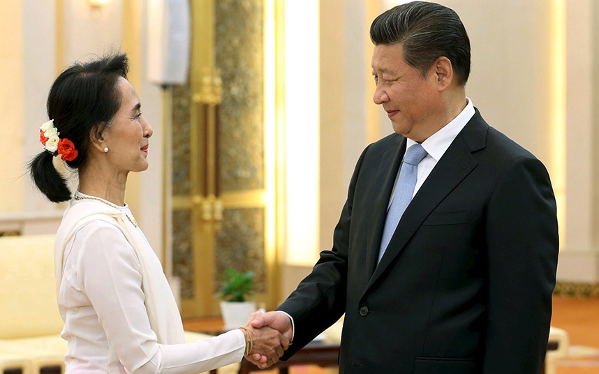 Chủ tịch Trung Quốc Tập Cận Bình bắt tay bà Aung Suu Kyi trong cuộc họp tại Đại lễ đường Nhân dân ở Bắc Kinh, Trung Quốc, vào ngày 11/6.