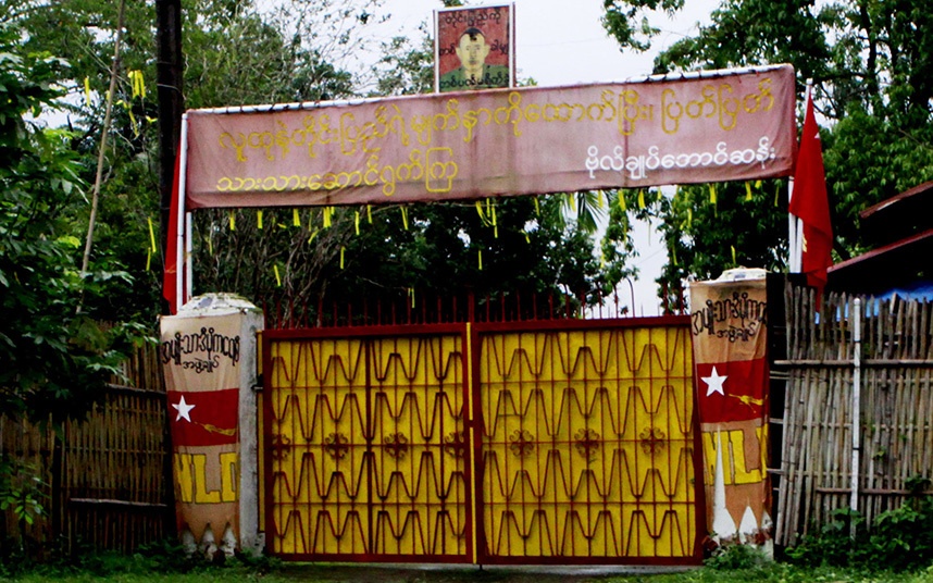 Cổng nhà bà Suu Kyi vào ngày 11/8/2009 khi tòa án cho rằng bà đã vi phạm các điều kiện quản thúc tại gia. Theo tòa Myanmar, bà Suu Kyi đã cho phép một người Mỹ lạ vào nhà. Người đứng đầu chế độ quân sự ra lệnh giam lỏng bà 18 tháng.