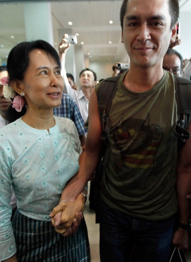 Trước áp lực quốc tế, bà Suu Kyi được trả tự do năm 2010. Ảnh chụp bà Suu Kyi gặp con trai Kim Aris tại sân bay Yangon ngày 23/11/2010. Bà đã không nhìn thấy con trong suốt 10 năm.