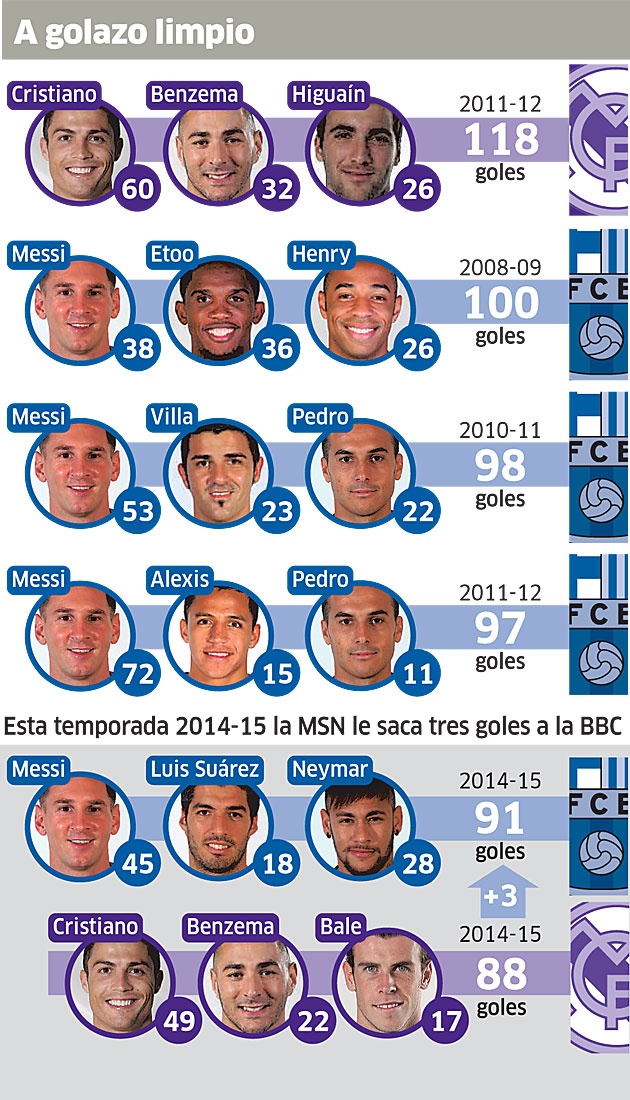 Lúc này hàng công hai đội đang hướng tới mốc 100 bàn thắng tại giải năm nay. Đây là cột mốc không phải tập thể nào cũng có thể đạt được. Tuy nhiên, so với thành tích của bộ ba Ronaldo – Benzema – Higuain cách đây 3 mùa giải, kết quả M.N.S và B.B.C đạt được hiện nay còn kém xa.