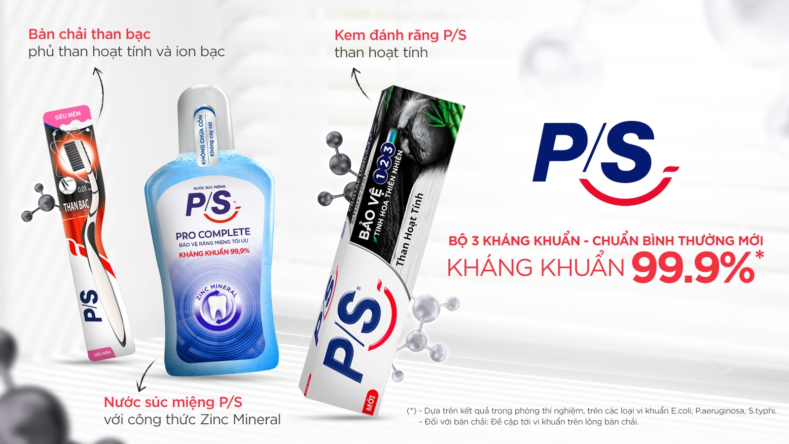 Bộ 3 P/S kháng khuẩn gồm kem đánh răng P/S than hoạt tính, nước súc miệng P/S với công thức Zinc Mineral, bàn chải phủ than hoạt tính và ion bạc giúp kháng khuẩn 99,9%(*). Việc vệ sinh răng miệng đều đặn mỗi ngày cùng bộ 3 P/S kháng khuẩn là lựa chọn tối ưu, giúp chăm sóc răng miệng và bảo vệ sức khỏe cho cả gia đình trong mùa cúm.