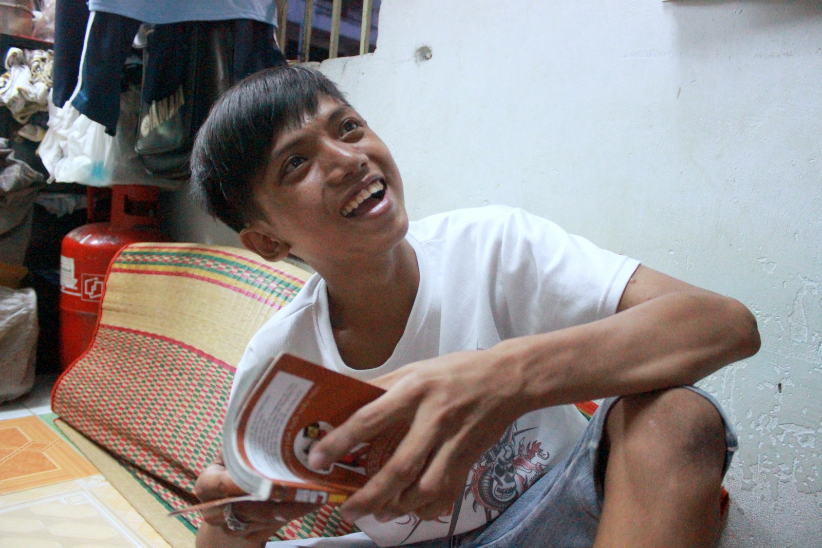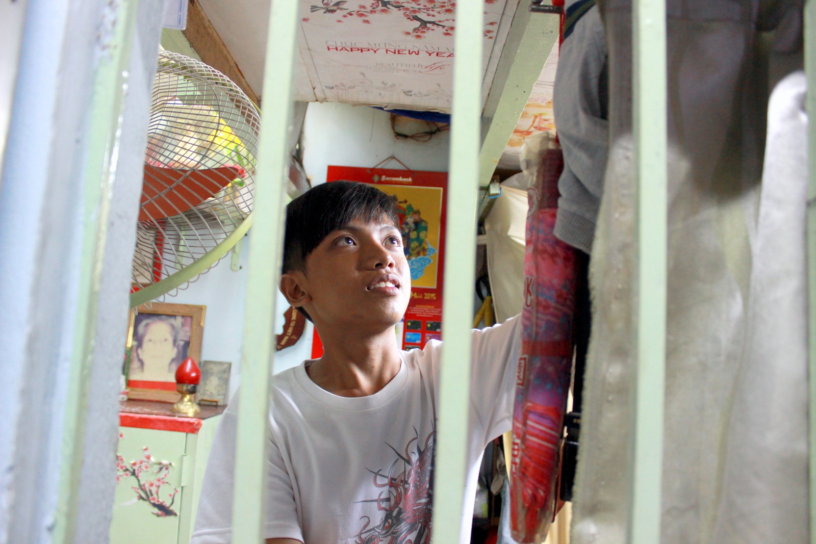 | Không gian sinh hoạt của gia đình Nguyễn Bá Cường rộng chưa đầy 10 m2. Do nhà chật hẹp, buổi trưa khá nóng song Cường cho hay, em sống từ nhỏ đến lớn tại đây nên dần quen. Dù năm nay 18 tuổi, trông dáng người nhỏ bé của Cường vẫn như một học sinh tiểu học. Bố Cường - ông Nguyễn Bá Quốc (48 tuổi) - cho biết, từ nhỏ, Cường bị nổi các vết đốm trên người, gia đình khó khăn nên không theo dõi, chữa trị đến cùng. Điều này ảnh hưởng đến chiều cao, còn sức khỏe của Cường vẫn bình thường. |