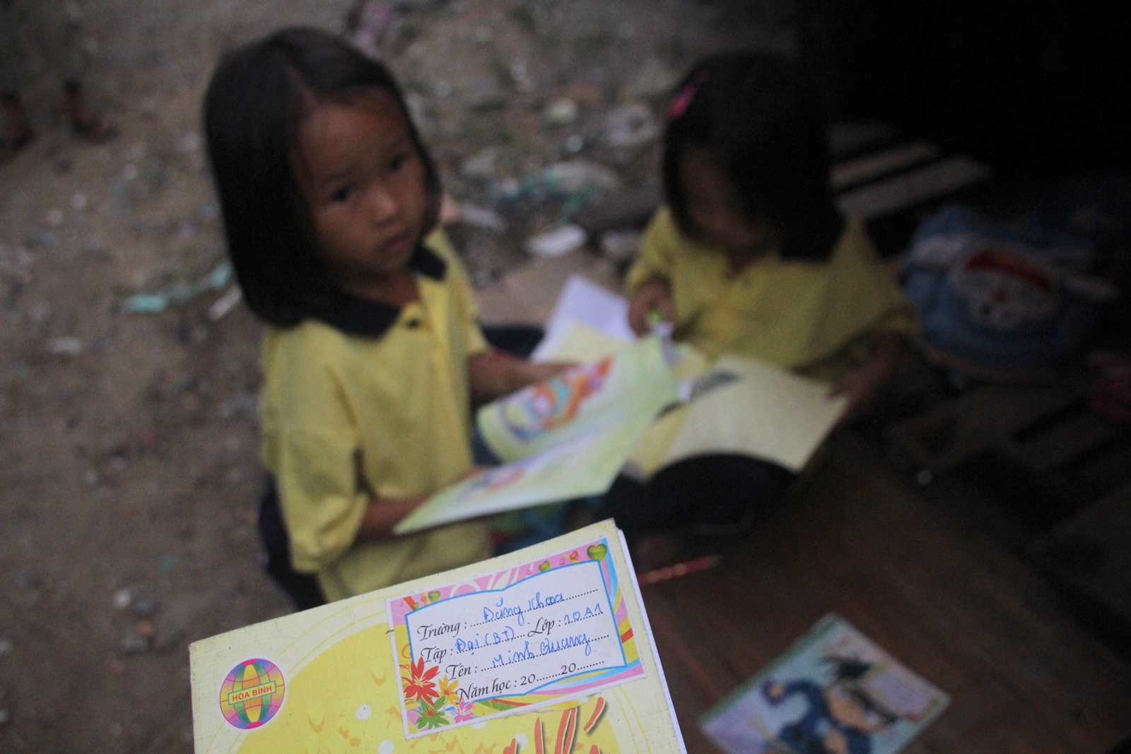 | Dù sống đường phố nhưng hai cô bé đều ngoan ngoãn, chịu học bài. Anh Tuấn vẫn cố gắng "mót" những con chữ mình chưa rơi rớt để dạy lại cho con. |