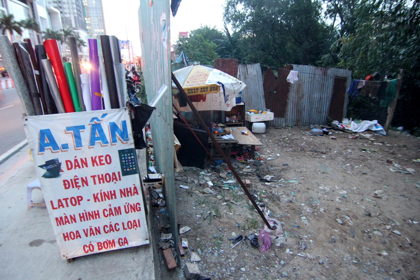 | Góc học tập của hai bé cũng là nơi để mấy cái chén bát, vài bộ quần áo nằm ở một bãi đất đang chờ thi công công trình ngay bên vỉa hè đường Nguyễn Hữu Thọ. Anh Tuấn quây chiếc dù, đặt trong đó cái bàn, ghế làm nơi cho con học tập. |