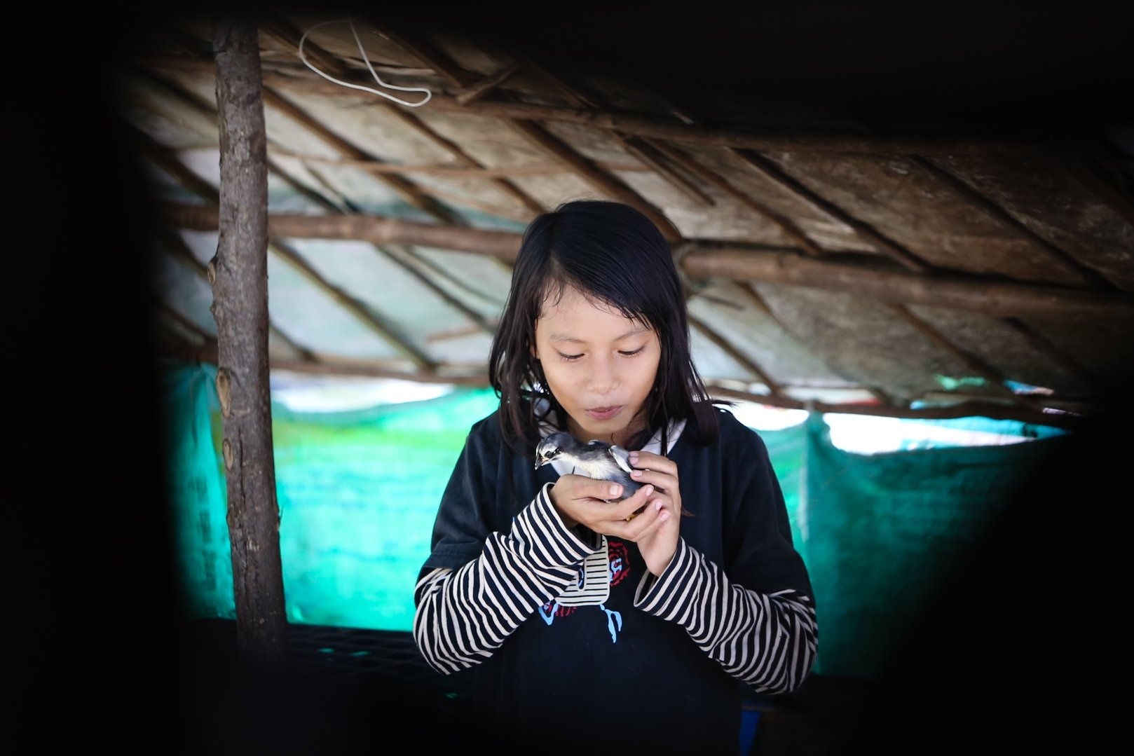 | Nơi bé Trốn ở rất cách xa thôn, một mình lủi thủi, ít bạn bè. Niềm vui của em lúc rảnh là chăm sóc những chú gà con do ông ngoại nuôi. |
