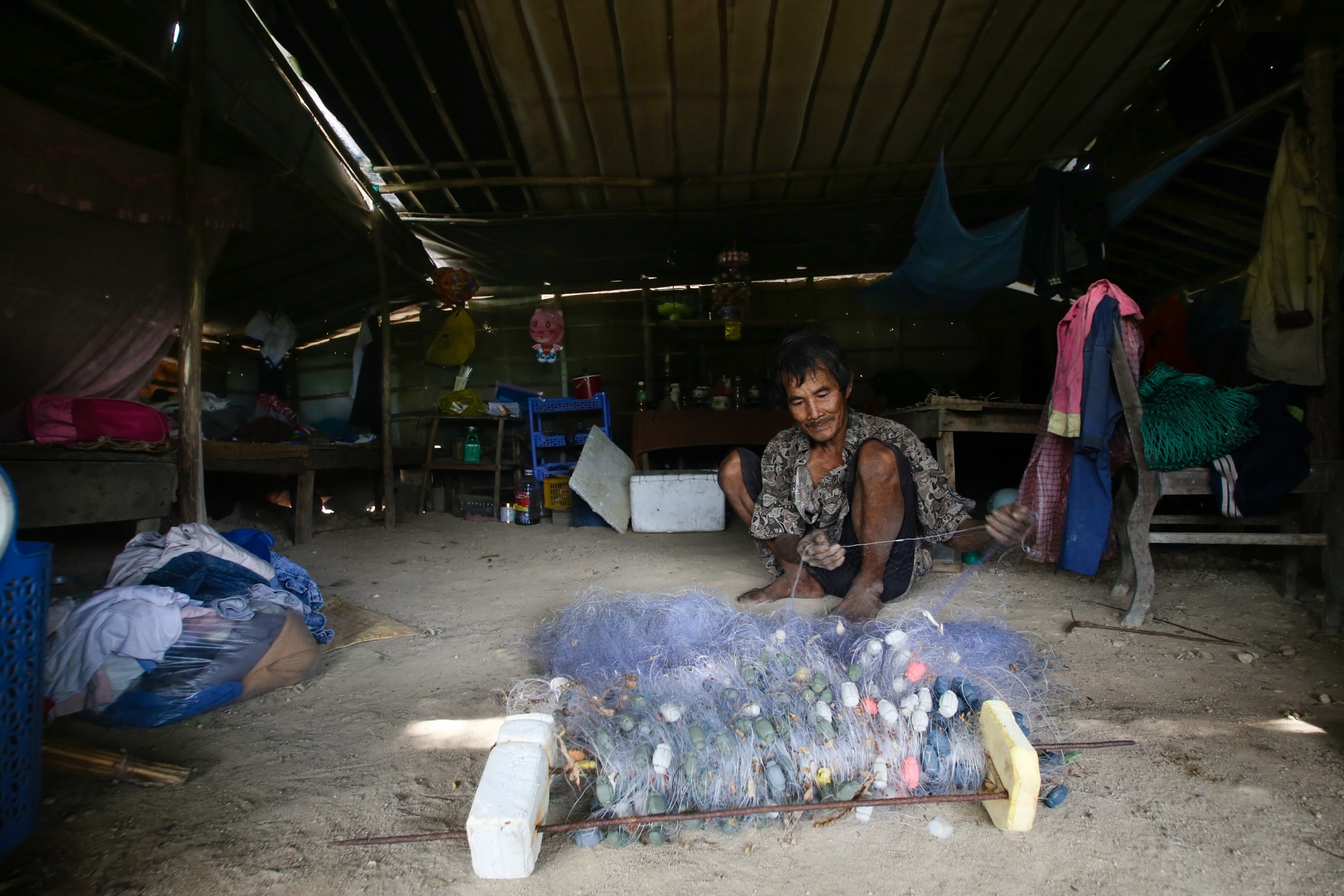 | Ông Nguyễn Văn Cang (ông ngoại của Trốn) năm nay 84 tuổi nhưng vẫn phải làm lụng vất vả. Hàng ngày, ông đi ra biển đánh bắt cá về bán. Bộ lưới ông dùng đã lâu và rách nhiều chỗ nên phải thường xuyên ngồi vá lại trước mỗi chuyến ra biển. |