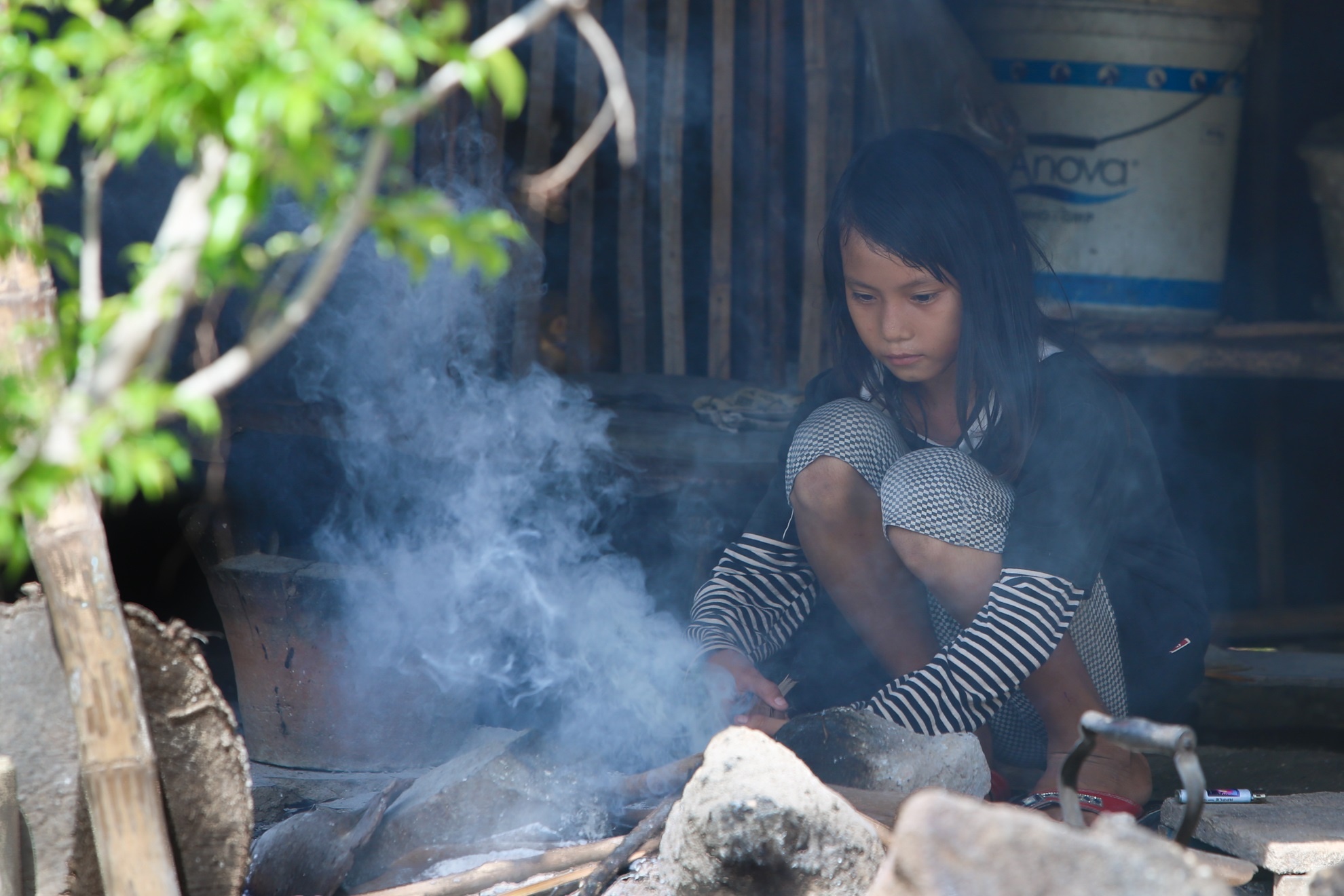 | Bé Trốn hàng ngày phụ ông ngoại nấu bắp, cơm nước trong nhà. |