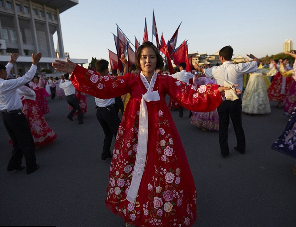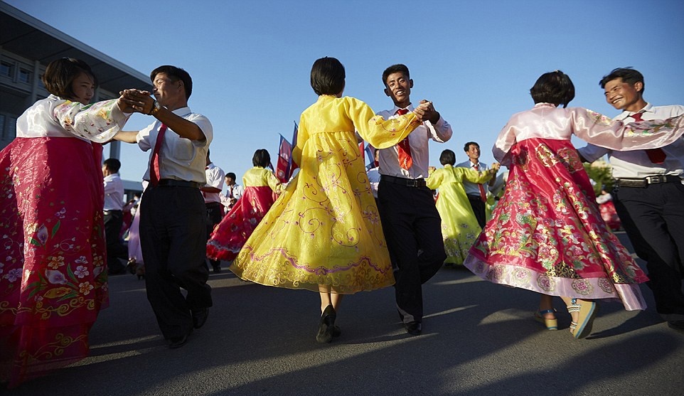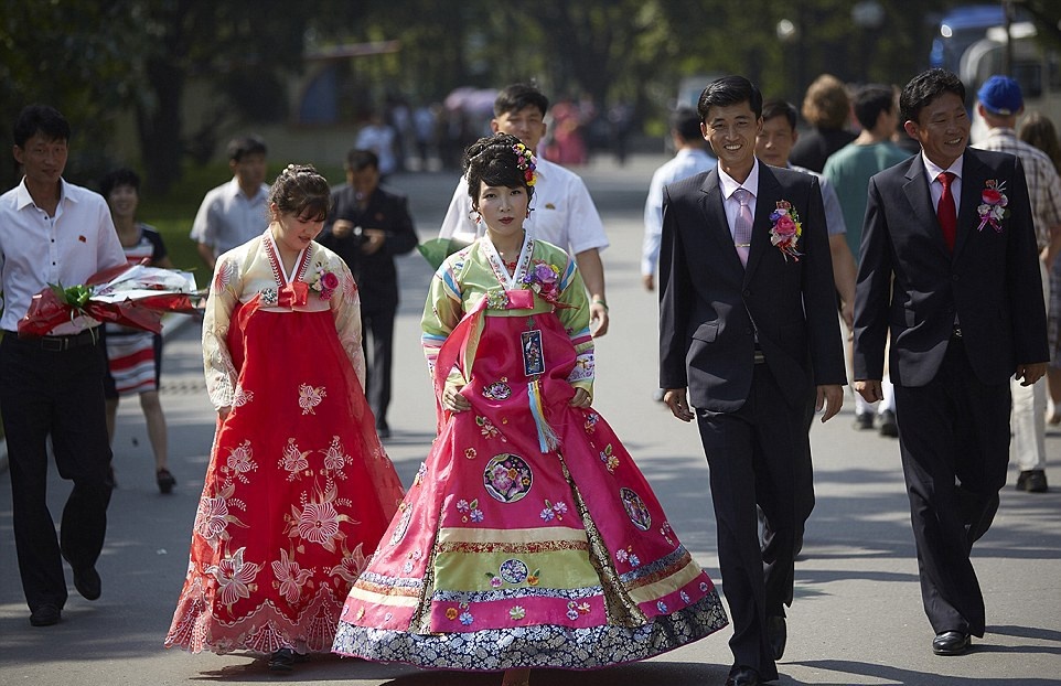 | Phụ nữ Triều Tiên đứng thẳng hàng dọc theo một con đường ở trung tâm thành phố Bình Nhưỡng để xem diễu hành. |