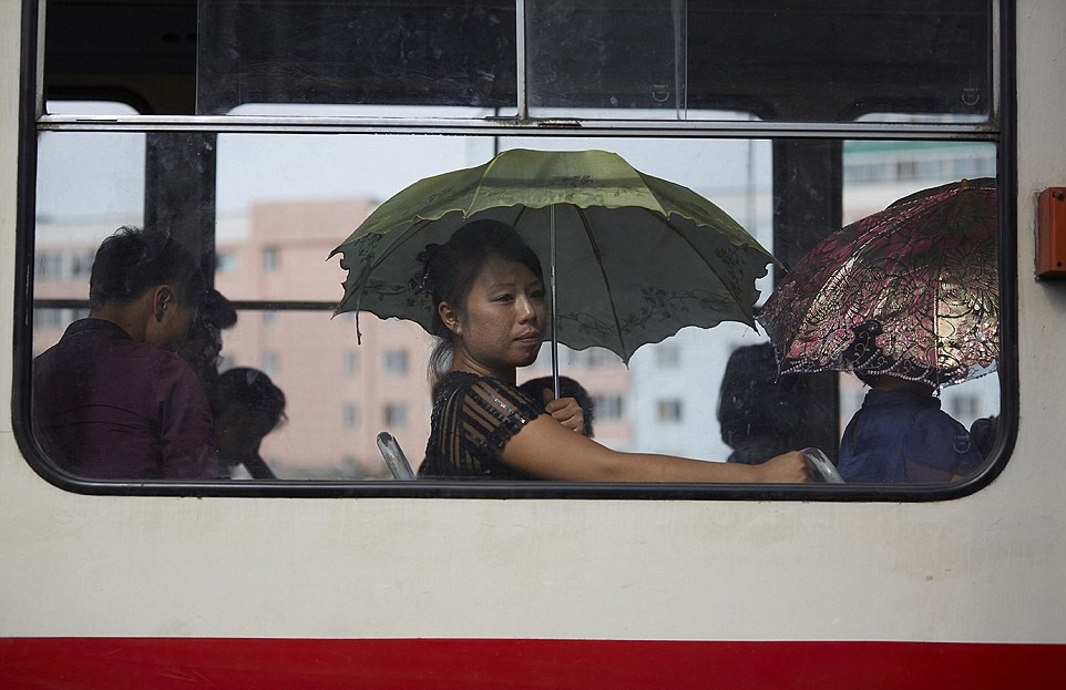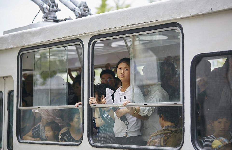 | Chiristian phát hiện người Triều Tiên cũng rất ưa chuộng smartphone, giày cao gót, máy ảnh kỹ thuật số. Trong hình là hình ảnh cô gái Triều Tiên nhìn ra ngoài cửa sổ trên một chiếc xe bus chật chội. |