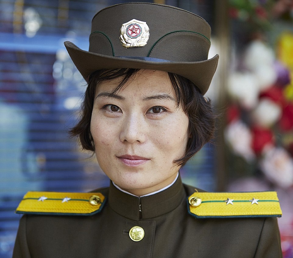 | Một nữ cảnh sát trong bộ đồng phục cao cổ màu ôliu. Christian phát hiện ra rằng hầu như ai cũng là người lính và họ đều mặc đồng phục. |