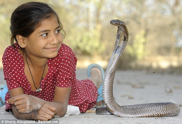 | Phần lớn trẻ em sợ rắn, nhưng Kajol Khan, một cô bé 11 tuổi ở thành phố Ghatampur, bang Uttar Pradesh, Ấn Độ, lại có thể chơi, vuốt ve những con rắn hổ mang chúa. |