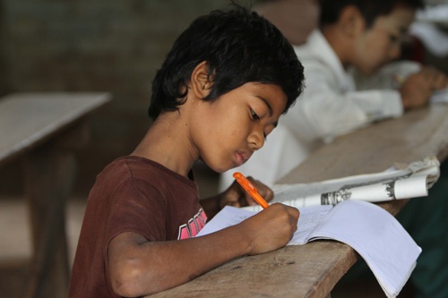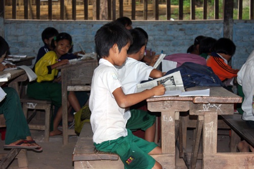 Do thiếu phòng học, các em học sinh bị gộp 2 lớp vào cùng một phòng.