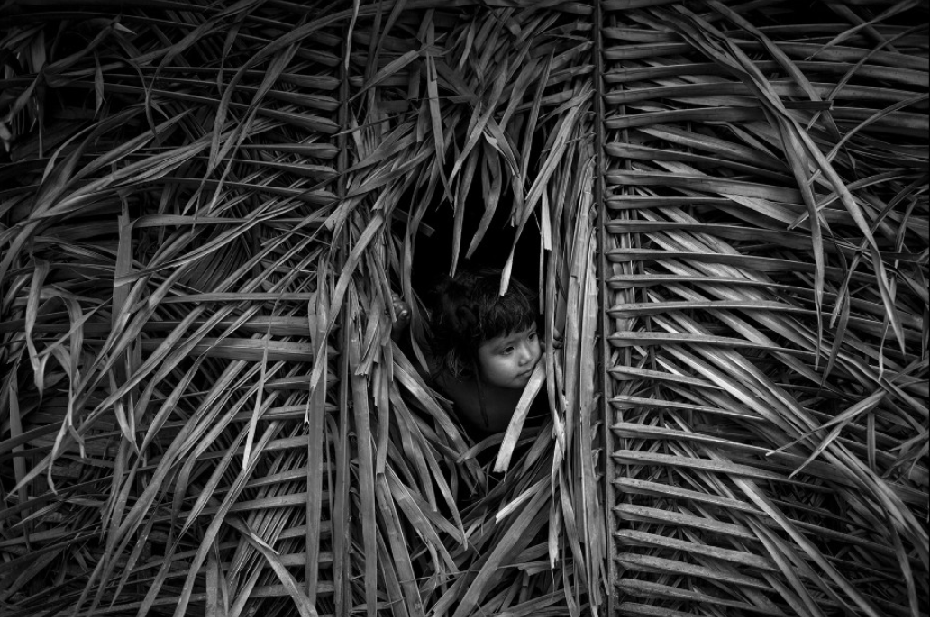 Một đứa trẻ Awa đứng bên trong "nhà" lợp bằng lá khô.