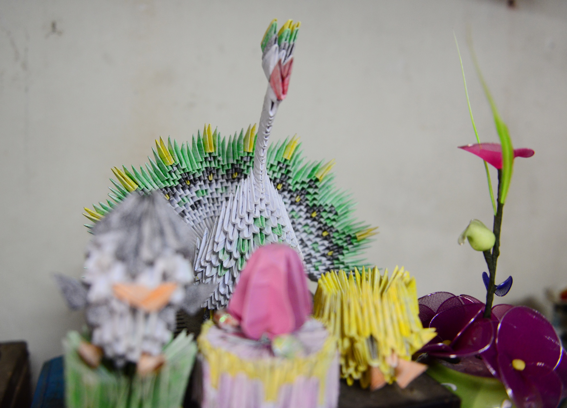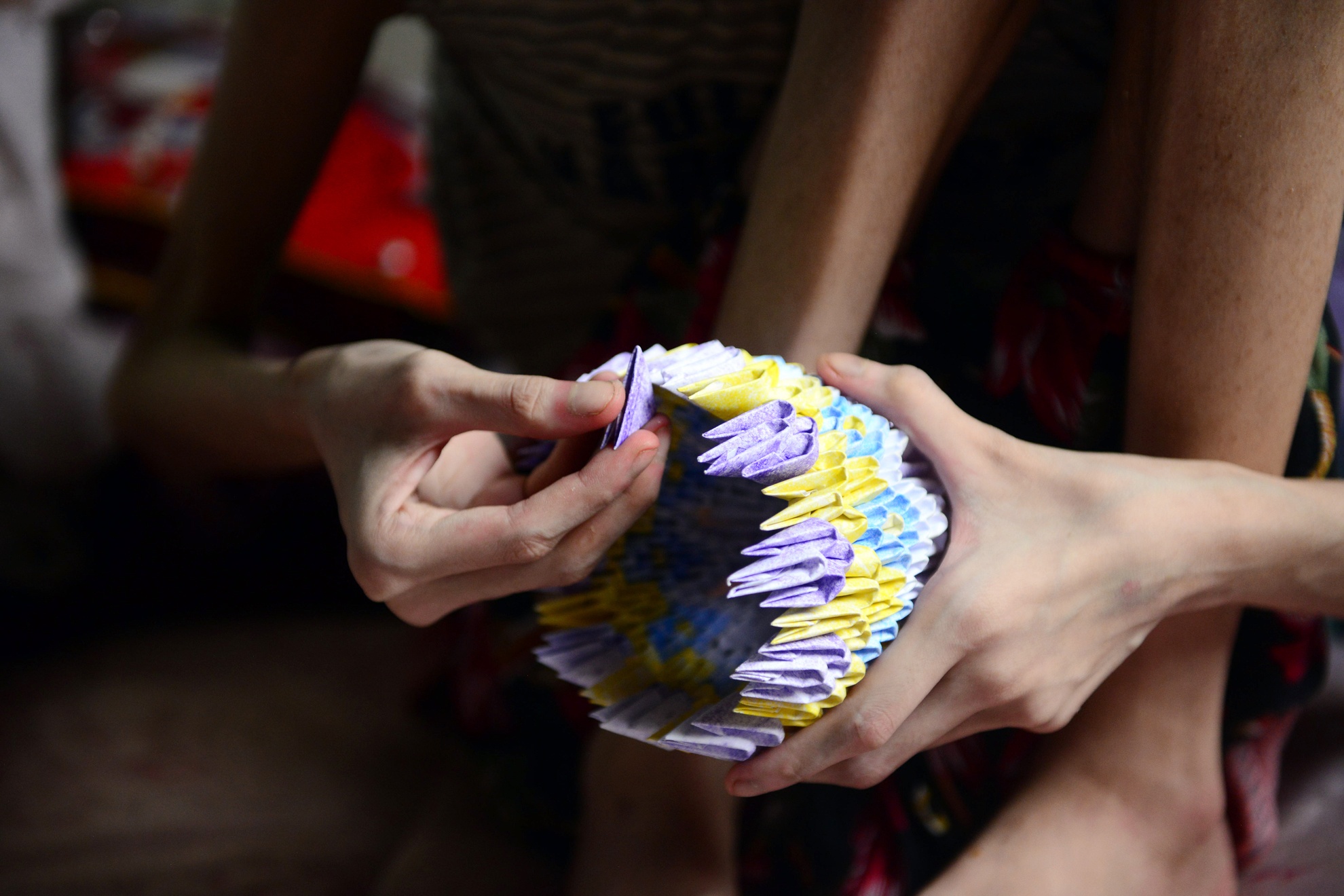 Mỗi sản phẩm hoàn thiện được Nhi trang trí ngăn nắp trên một góc bàn cạnh giường. Những người đến thăm em đều thích thú và ngỏ ý muốn mua về.