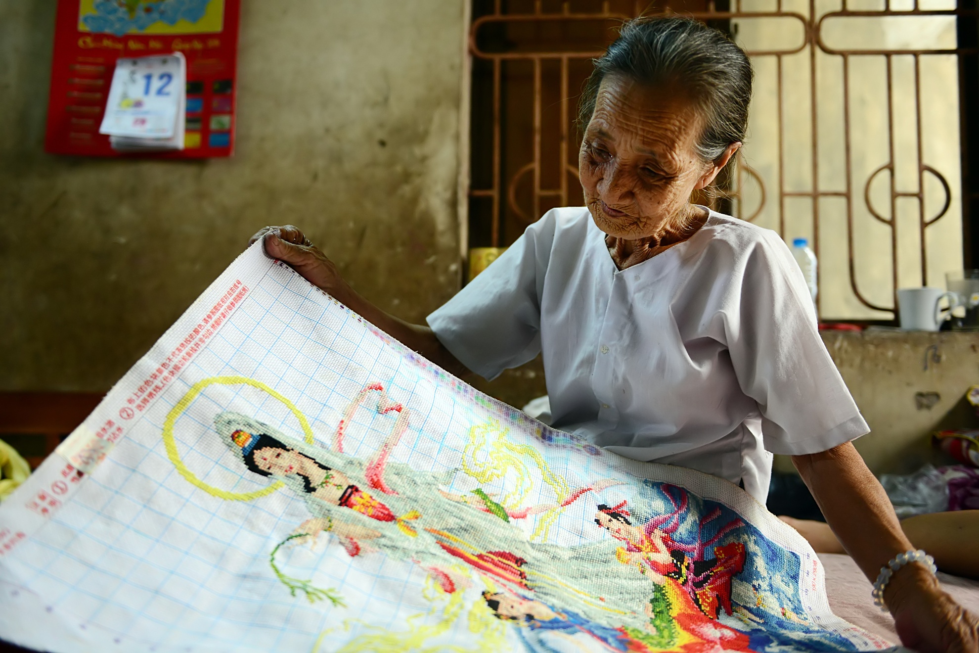 Bức tranh phật bà quan âm em thêu tặng bà nội. Đối với bà, đây là món quà vô giá từ cô cháu gái mà bà thương yêu nhất.