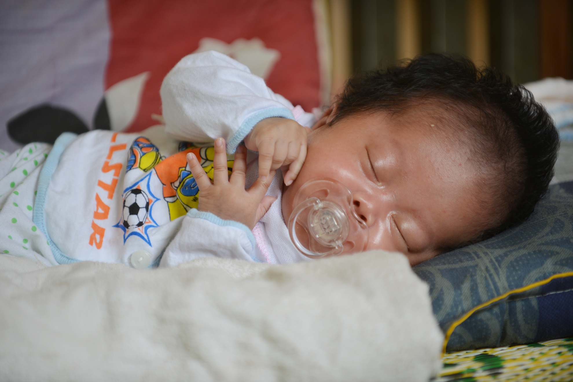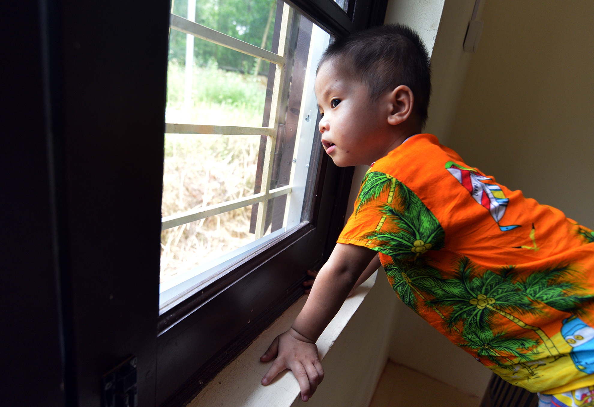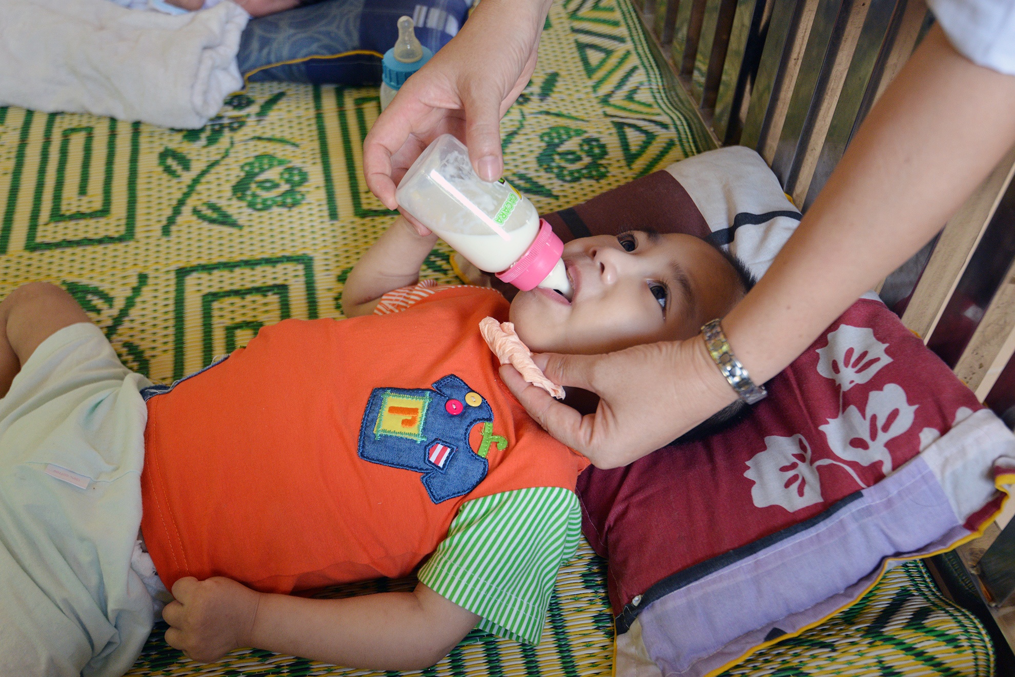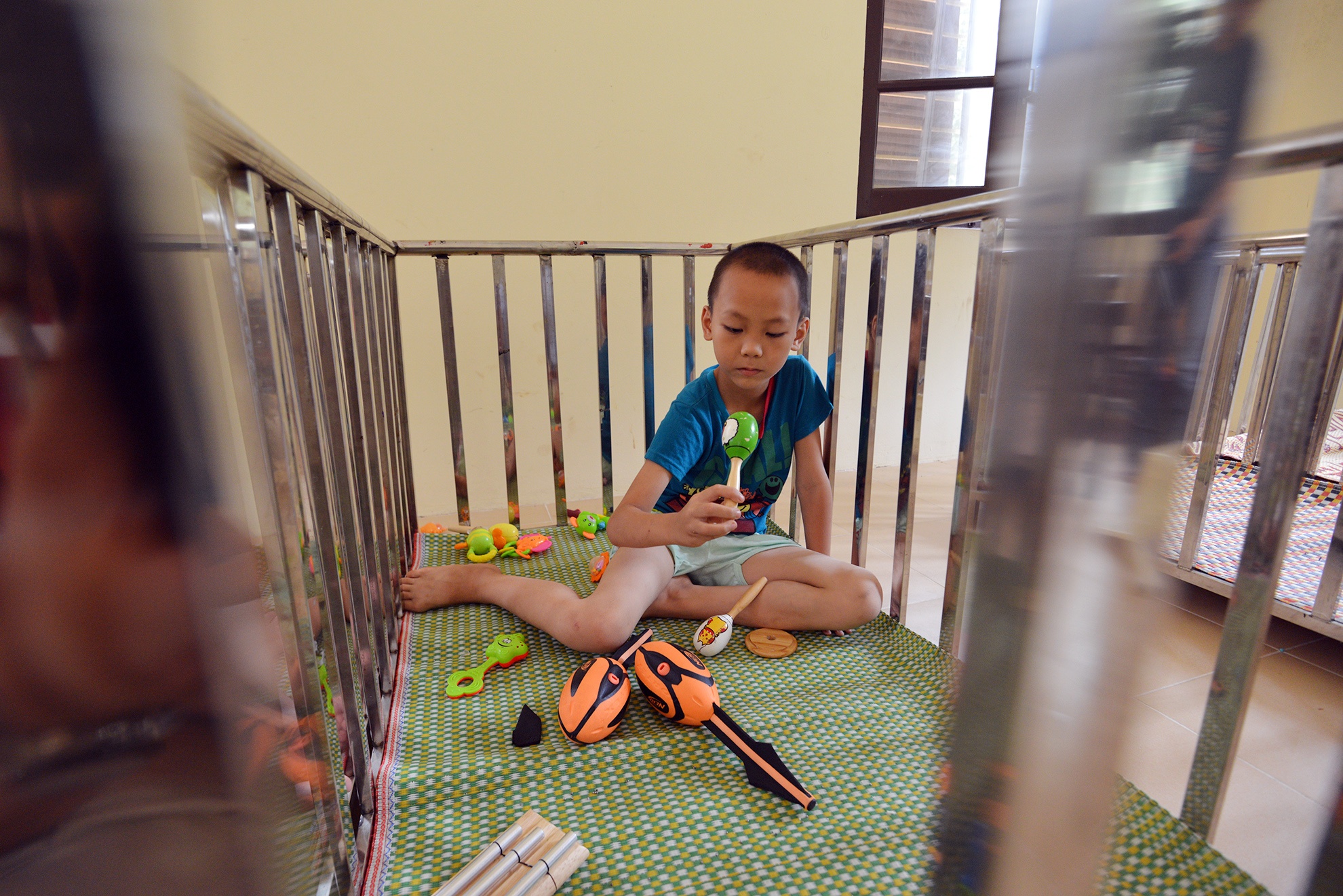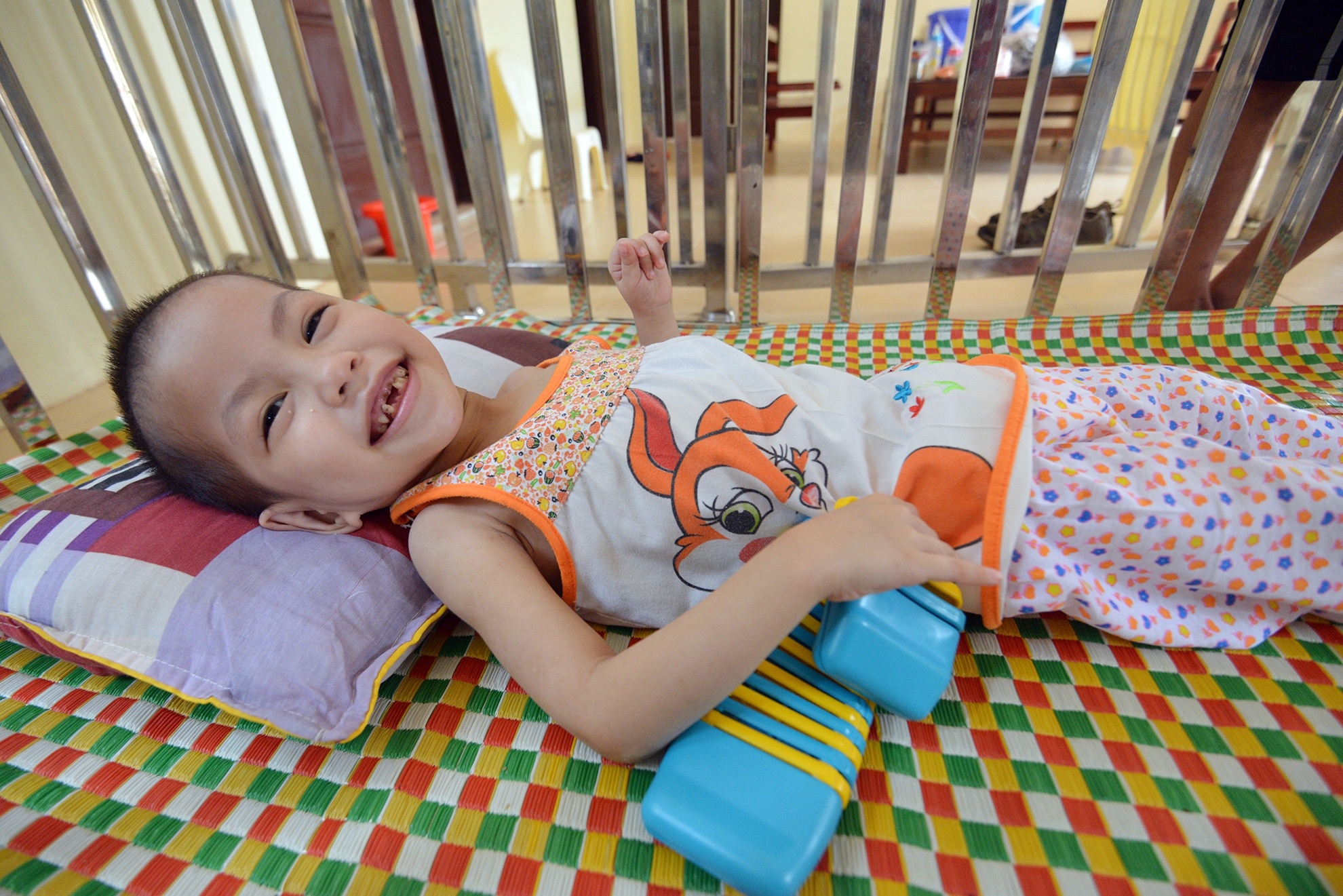 Khác với các bé khác, em Cù Văn Phúc khá trầm tính, thi thoảng em mới ra ngoài vì chủ yếu em ở trong giường để chơi đồ hàng.
