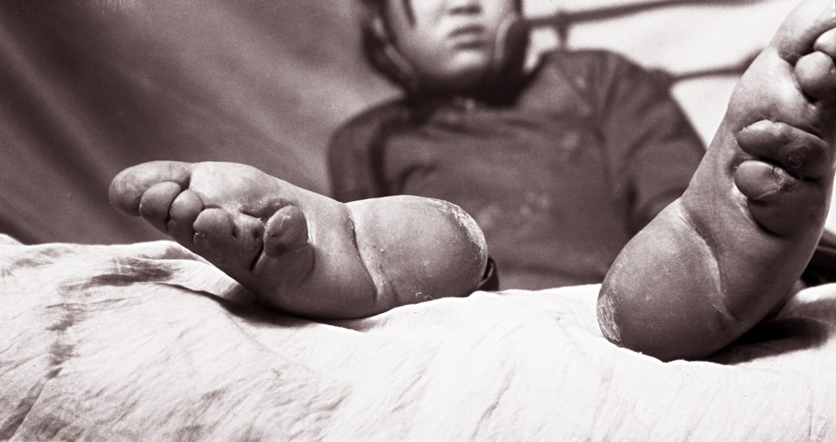 Đôi chân dị thường của một phụ nữ Trung Quốc. Tục bó chân khiến các thiếu nữ chịu đau đớn để có bàn chân nhỏ, chuẩn mực của cái đẹp trong quá khứ ở đất nước này. |