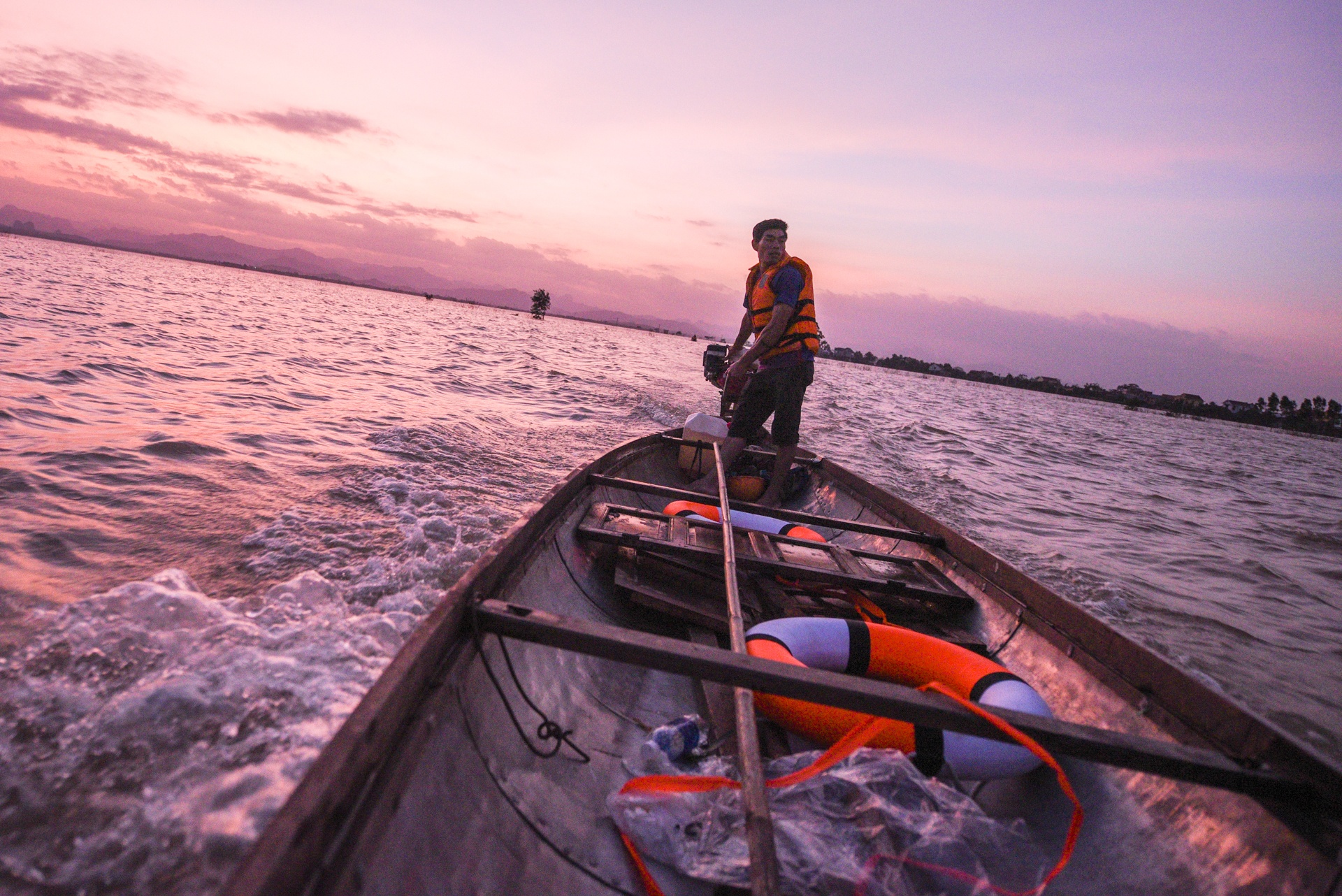 Chiều muộn, ánh mặt trời ráng đỏ. Phía xa xa, những cánh đồng lúa, con đê trải dài dọc theo sông Kiến Giang vẫn là một biển nước mênh mông.