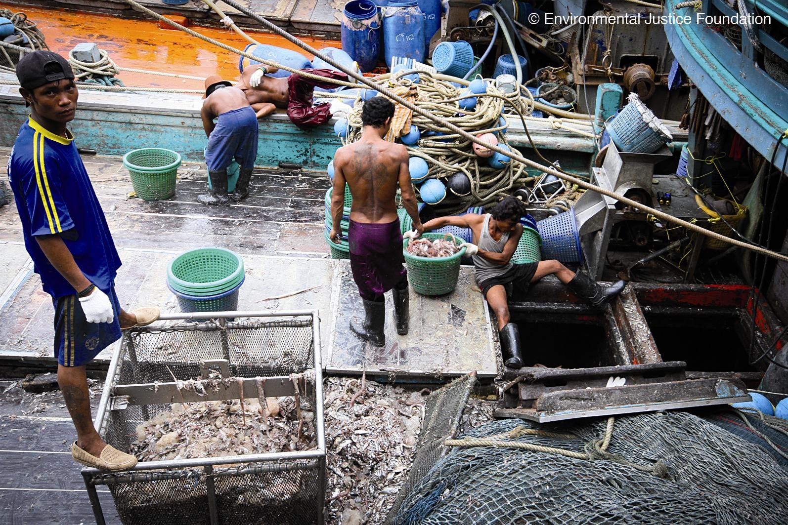 EJF cho rằng nạn cưỡng bức lao động trên các con tàu đánh cá ở Thái Lan liên quan mật thiết tới nhu cầu đang ngày càng tăng đối với sản phẩm hải sản giá rẻ, trong khi lượng tôm cá đang giảm dần. Tàu cá phải di chuyển xa hơn, các chuyến đánh bắt trở nên dài hơn, nhưng sản lượng cá trong mỗi chuyến lại giảm. Vì thế, công việc đánh cá trở nên vất vả và không hấp dẫn đối với người lao động trong nước.